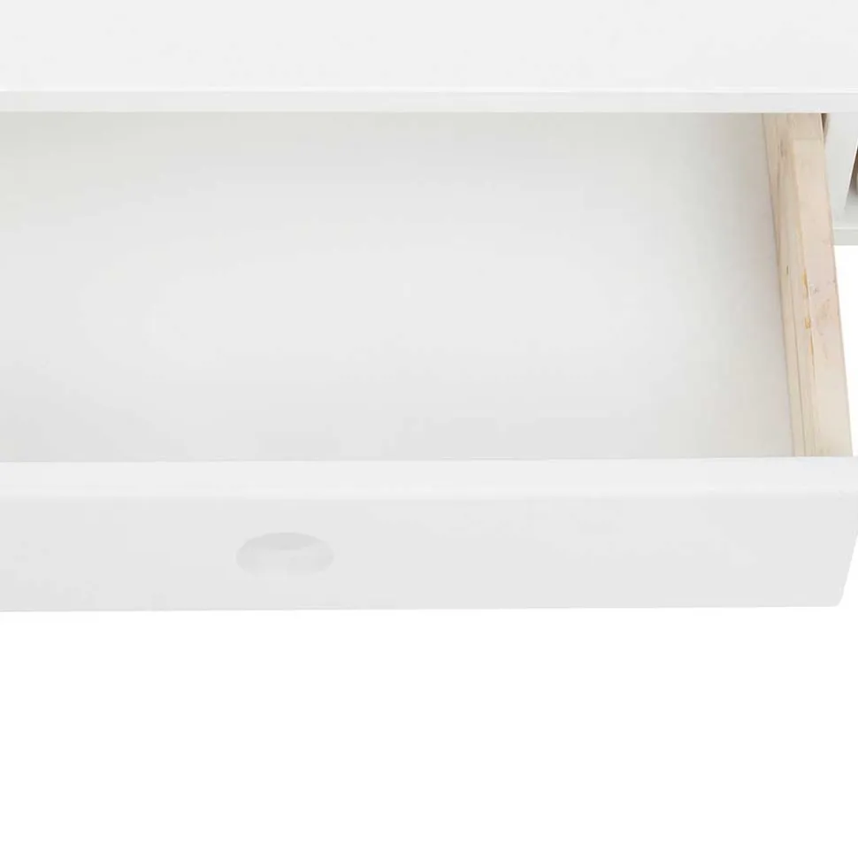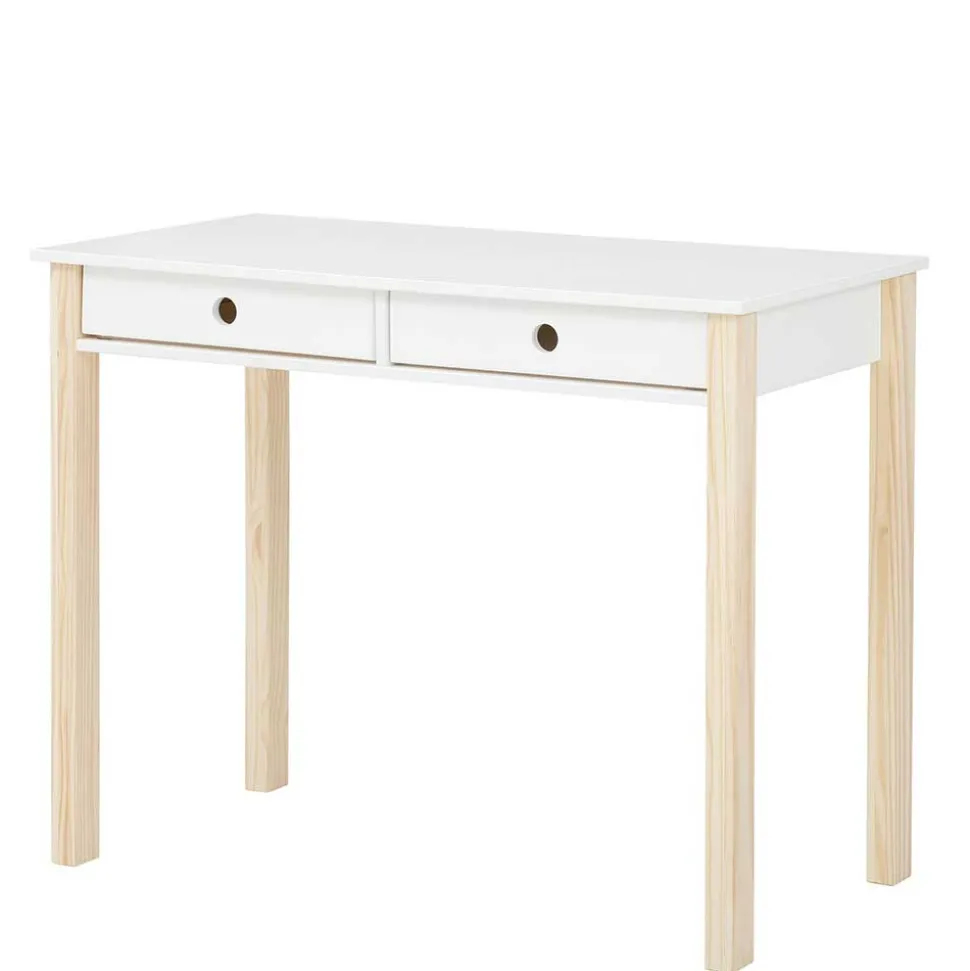Der Schreibtisch bietet mit zwei Schubladen praktischen Stauraum für Schreibutensilien und Kleinigkeiten. Die Holzauszüge und rund ausgefrästen Grifflöcher in den Schubladenfronten ermöglichen eine einfache Bedienung, während die Innenmaße von je ca. 39,5 x 8 x 32,5 cm für eine optimale Organisation sorgen. Mit einer Belastbarkeit von bis zu 25 kg ist der Schreibtisch auch größeren Anforderungen gewachsen.