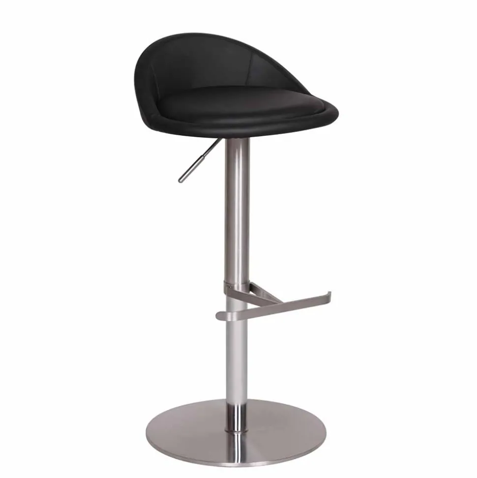 Die solide Säule und die runde Bodenplatte aus gebürstetem Edelstahl verleihen dem Barhocker nicht nur eine edle Optik, sondern auch hervorragende Stabilität bis zu einer Belastbarkeit von 110 kg. Das kühle Metall harmoniert perfekt mit dem schwarzen Kunstleder und sorgt für einen modernen, luxuriösen Gesamteindruck.