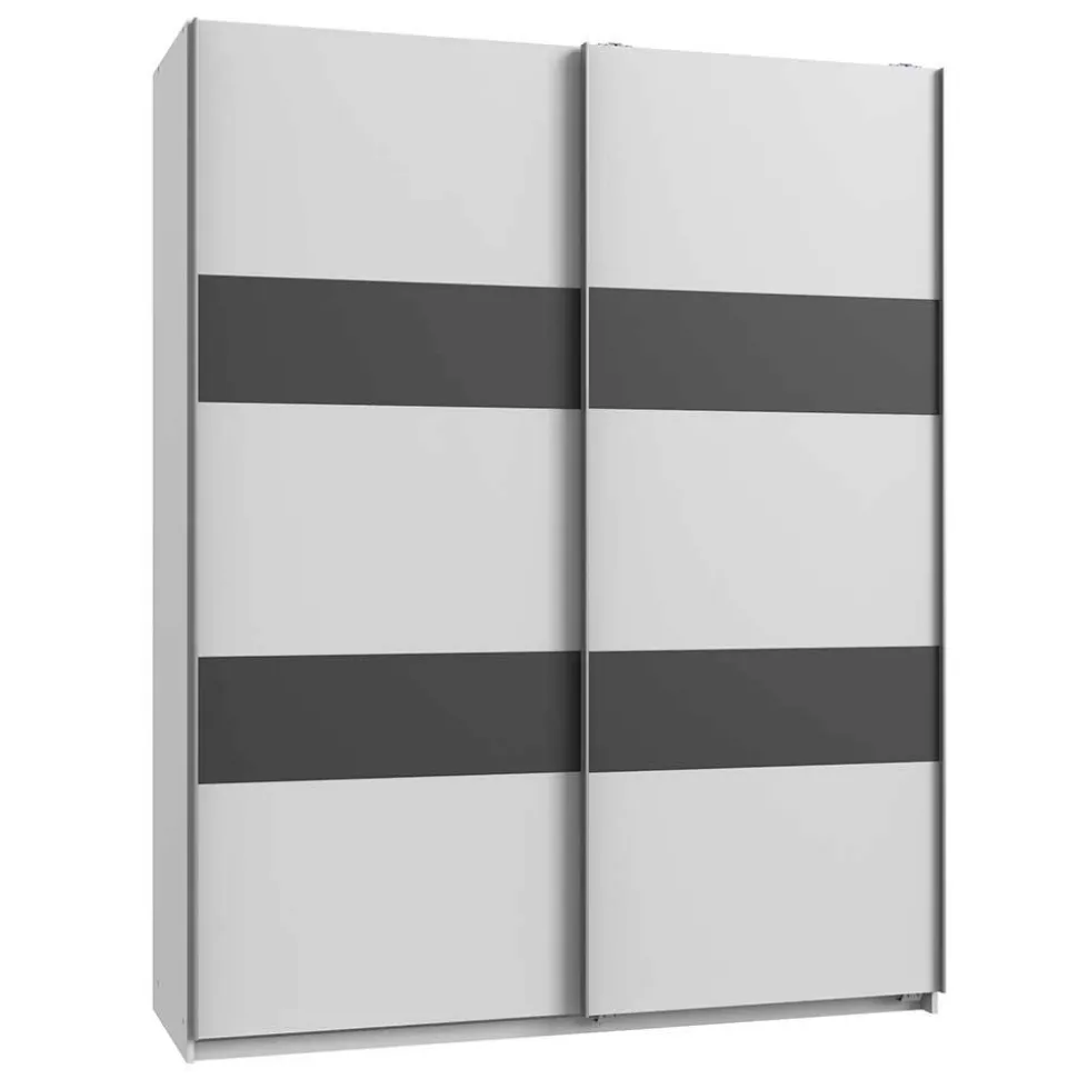Die gelungene Farbkombination aus Weiß und Dunkelgrau verleiht dem Schrank eine moderne, stilvolle Optik, die in jedem Raum für einen echten Hingucker sorgt. Die dekorativen Blenden in Dunkelgrau setzen dabei einen edlen Akzent und runden das Design gekonnt ab. Die langen Metallgriffleisten in Alufarben sorgen nicht nur für eine elegante Erscheinung, sondern ermöglichen auch ein komfortables Öffnen und Schließen der Türen.