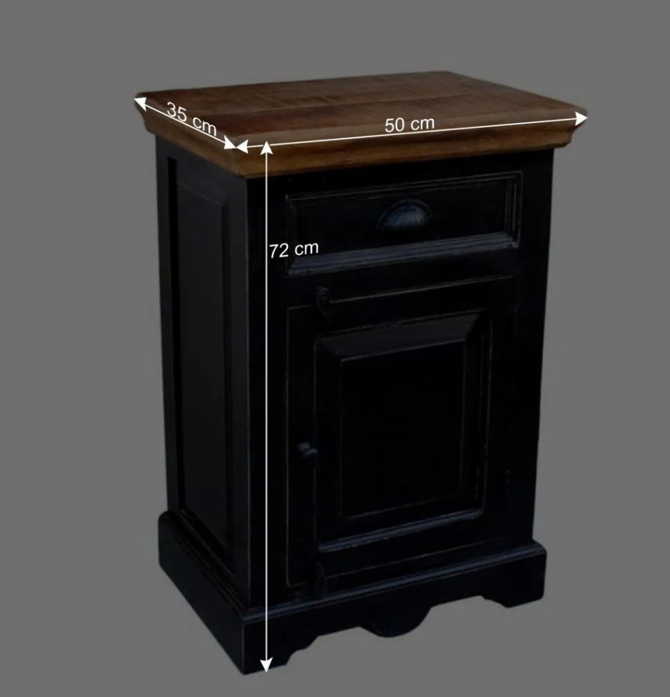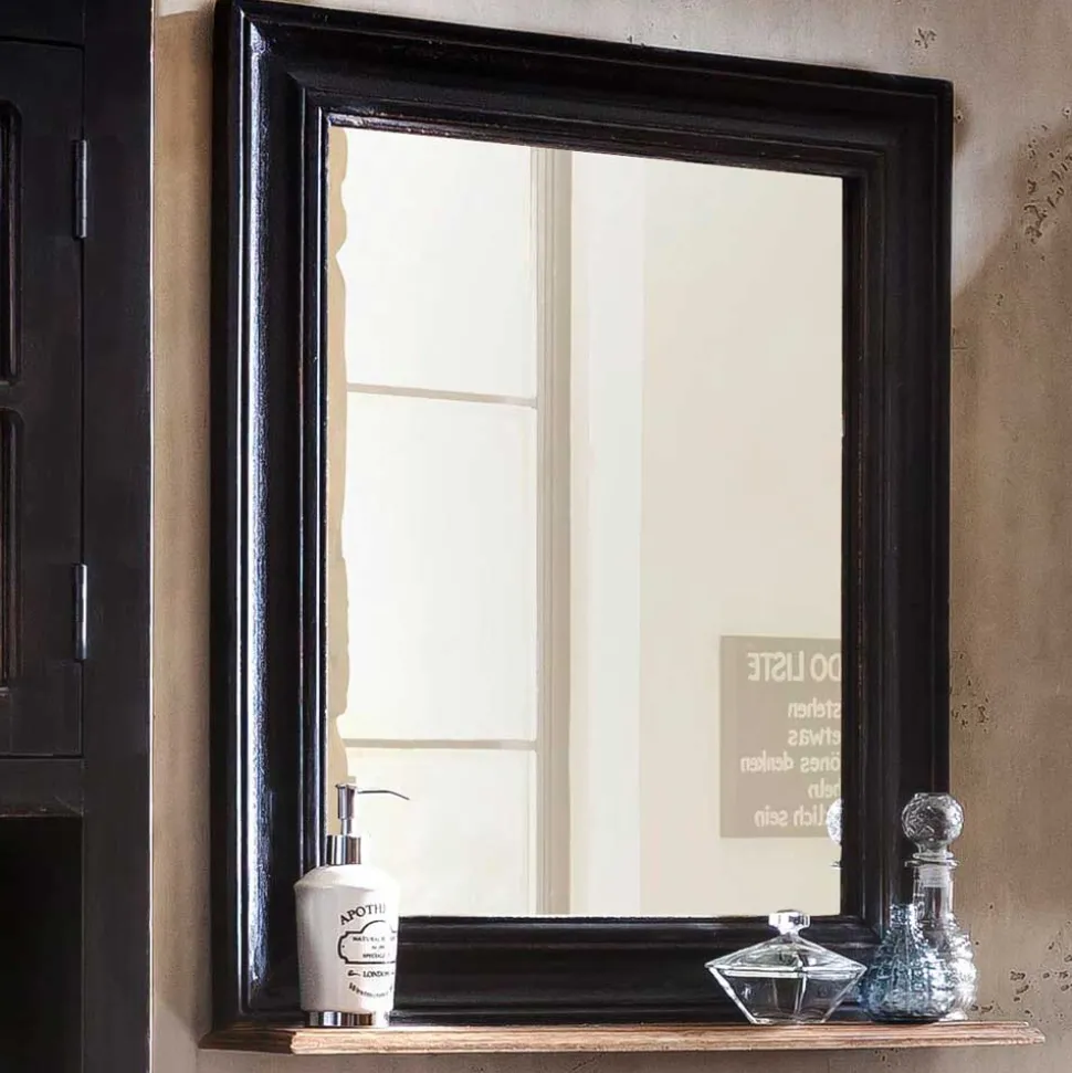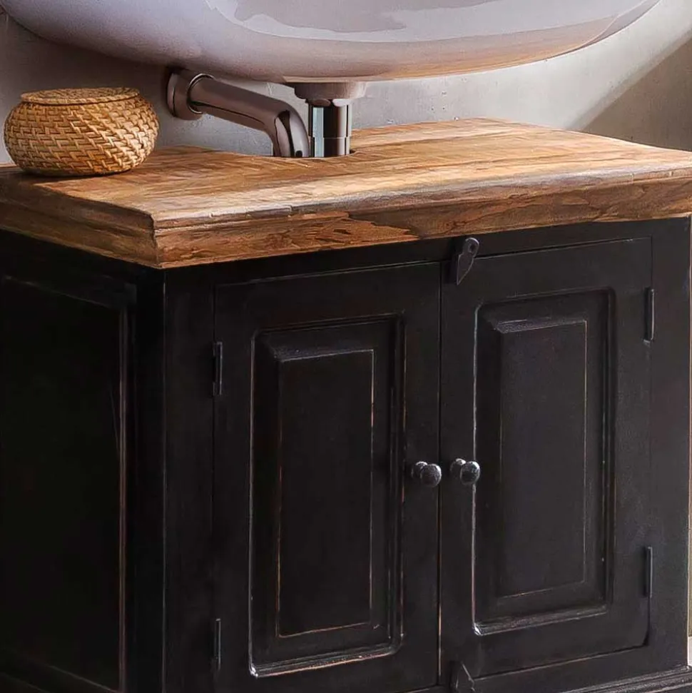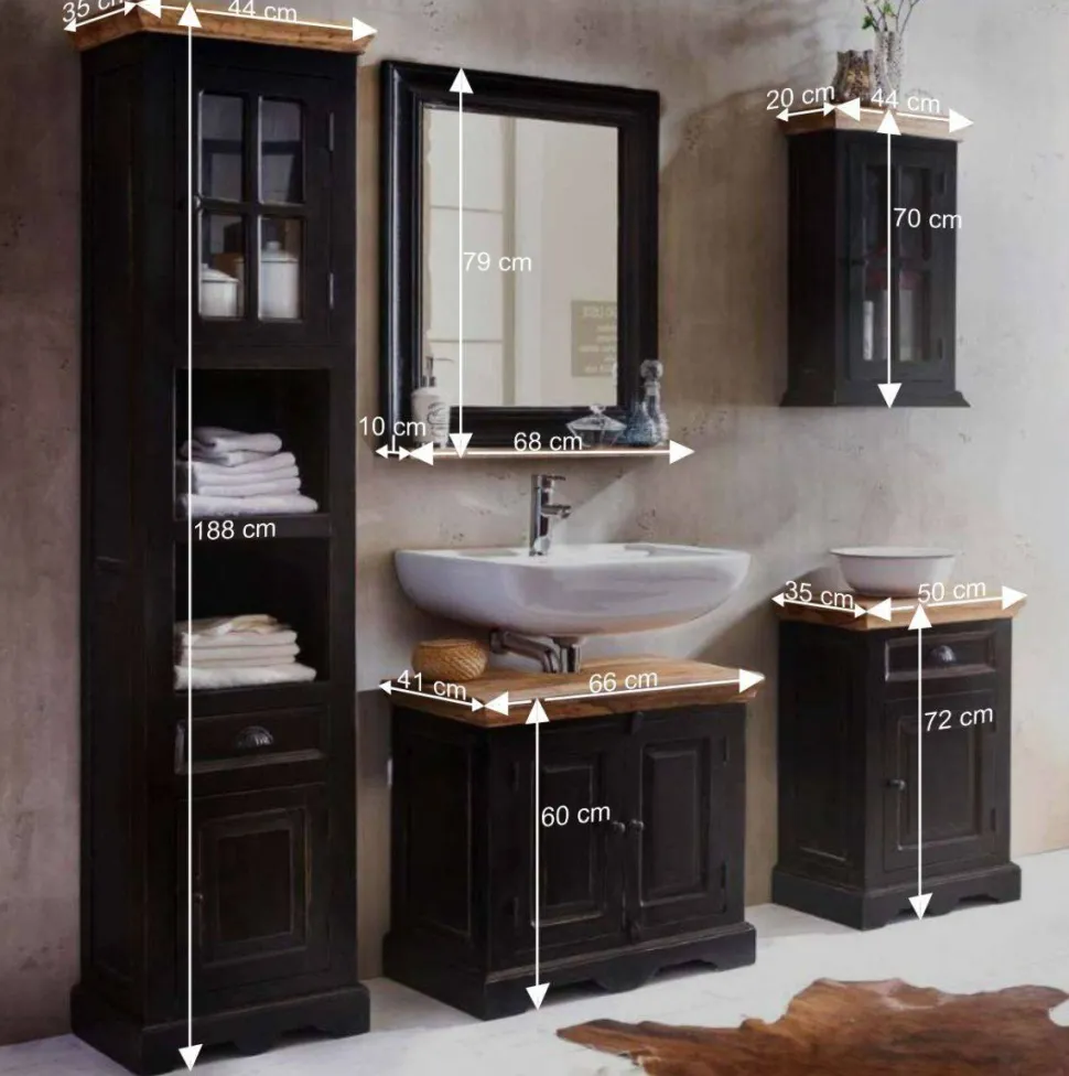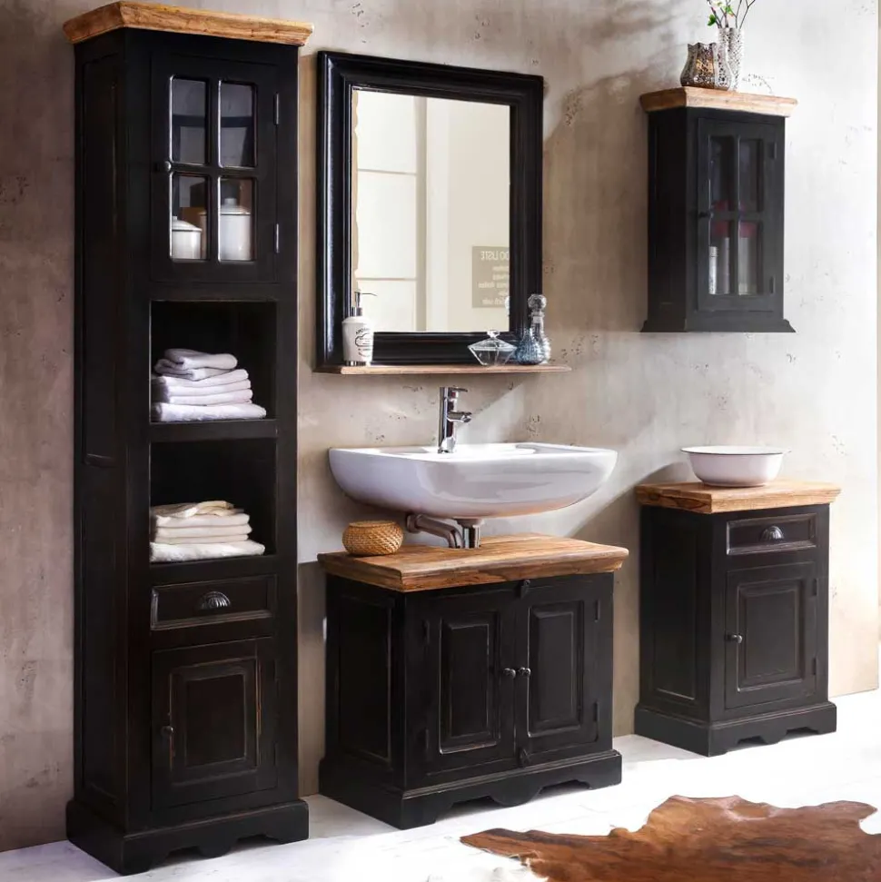Die Möbel dieses Sets sind in schwarz mit einem Antik Finish lackiert, das den Kolonialstil unterstreicht. Die Deckplatten aus Massivholz sind honigfarbig lackiert, was einen optischen Akzent setzt und das Badezimmer mit einer natürlichen Ausstrahlung belebt. Die beabsichtigten Gebrauchsspuren auf den Oberflächen tragen zum Charme des Sets bei und erzeugen eine gemütliche, wohnliche Atmosphäre.