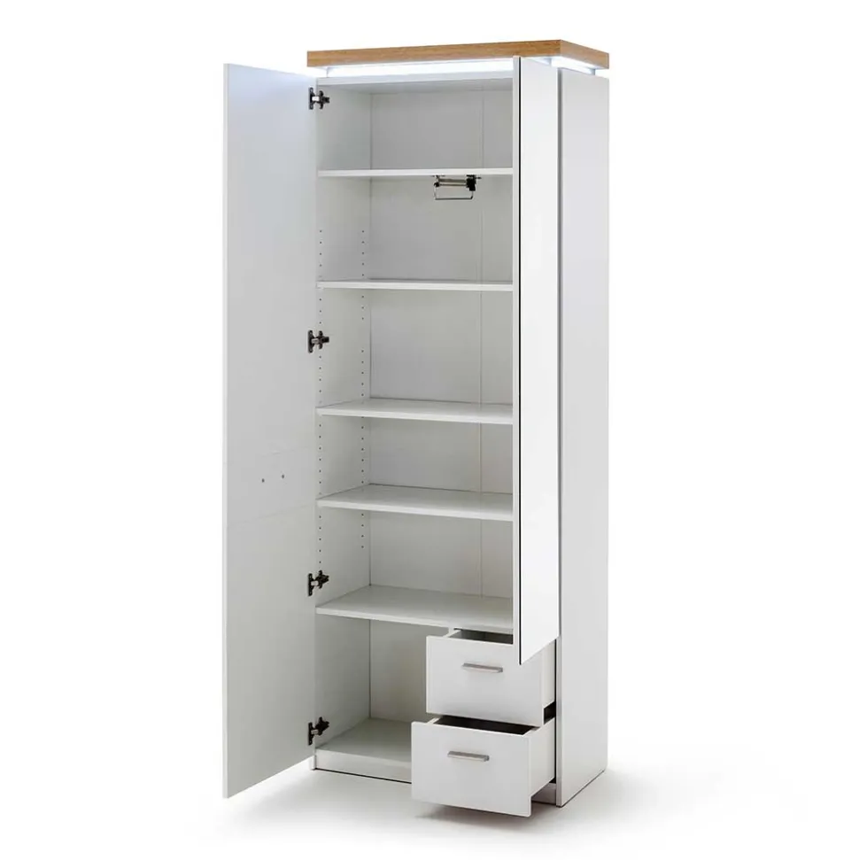 Zusätzlich wird der Oberboden mit einer ansprechenden Holzoptik in Wildeiche abgesetzt. Diese feine optische Abgrenzung verleiht den Möbelstücken einen individuellen, modernen Charakter und sorgt dafür, dass Ihre Garderobe nicht nur funktional, sondern auch ein echter Blickfang ist. Das Melaminbeschichtungsverfahren ist besonders pflegeleicht und schützt die Oberflächen zuverlässig vor äußeren Einflüssen.