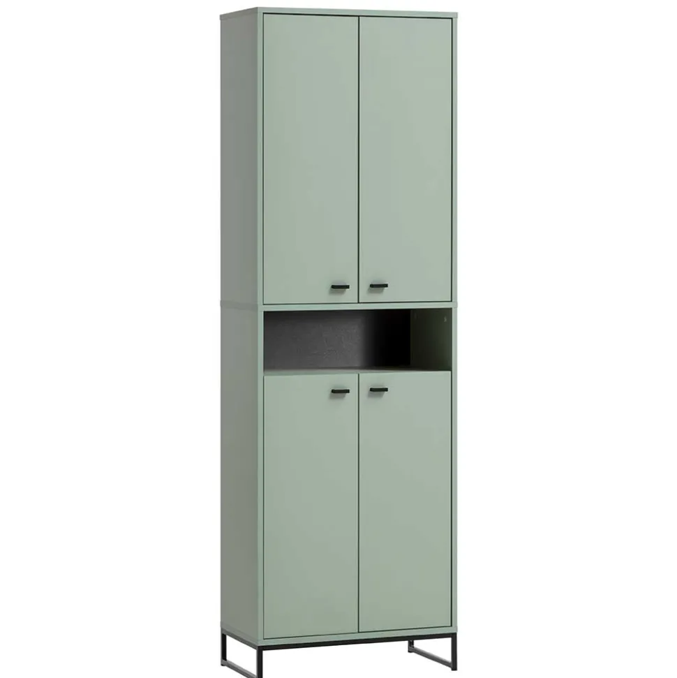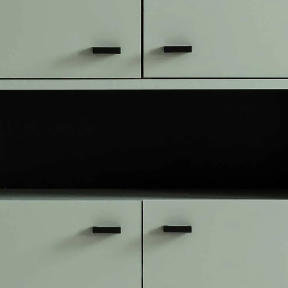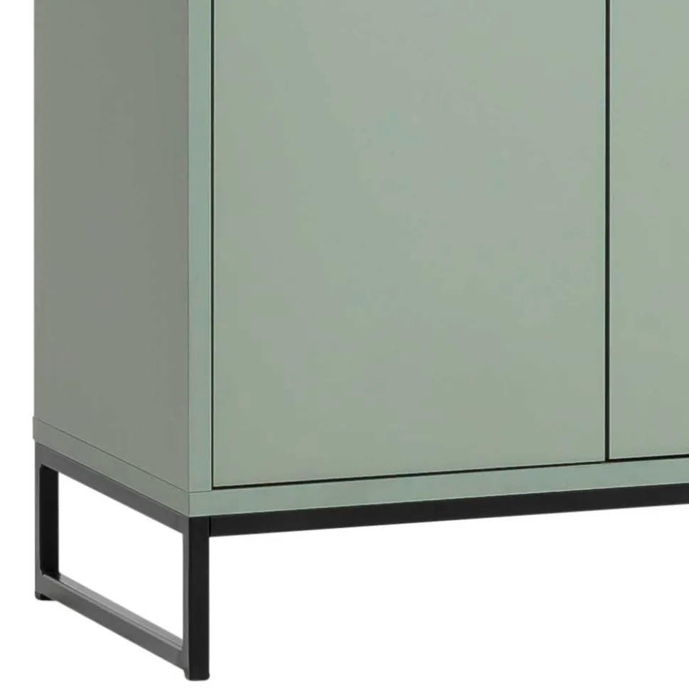 Die schwarzen Griffleisten aus Metall sorgen nicht nur für einen stilvollen Kontrast, sondern erleichtern auch die Bedienung der Türen. Das schwarze Metallbügelgestell hebt den Schrank dezent vom Boden ab und verleiht ihm eine schwebende Leichtigkeit, die den Raum größer wirken lässt. Eine Kippsicherung zur Wandmontage sorgt für zusätzliche Sicherheit, besonders in Haushalten mit Kindern oder Haustieren.