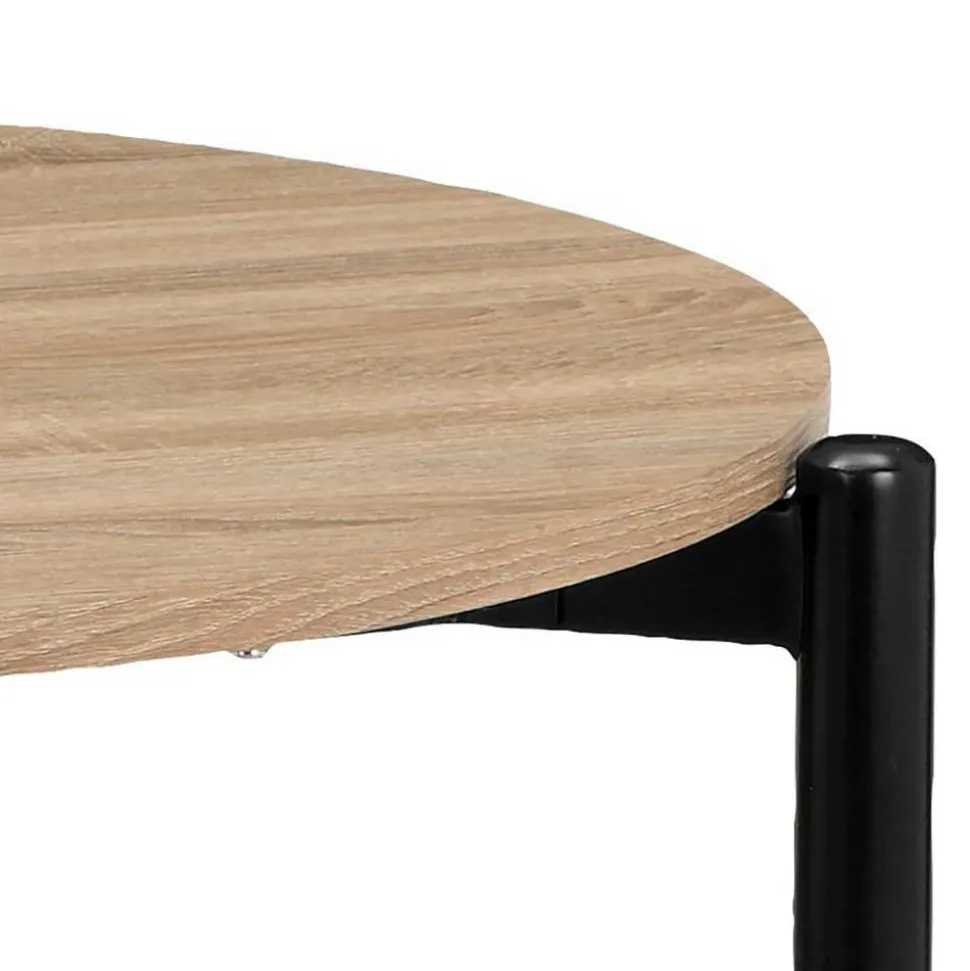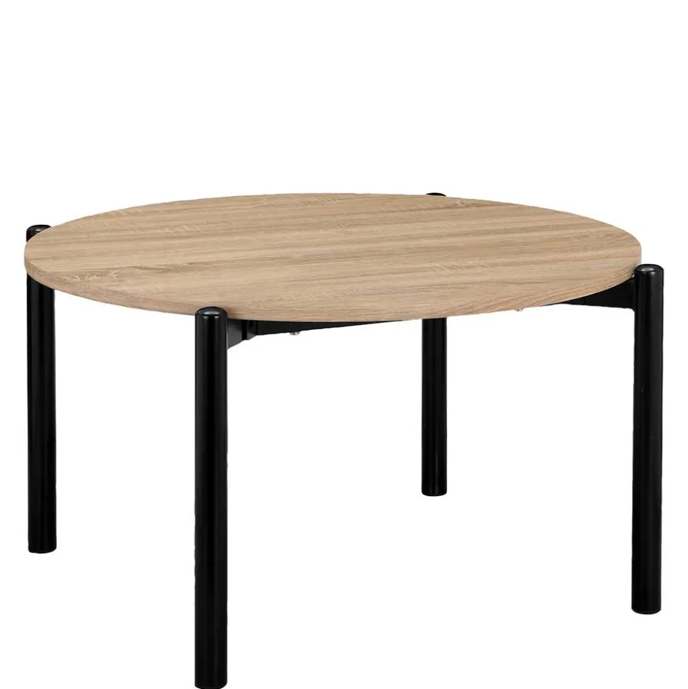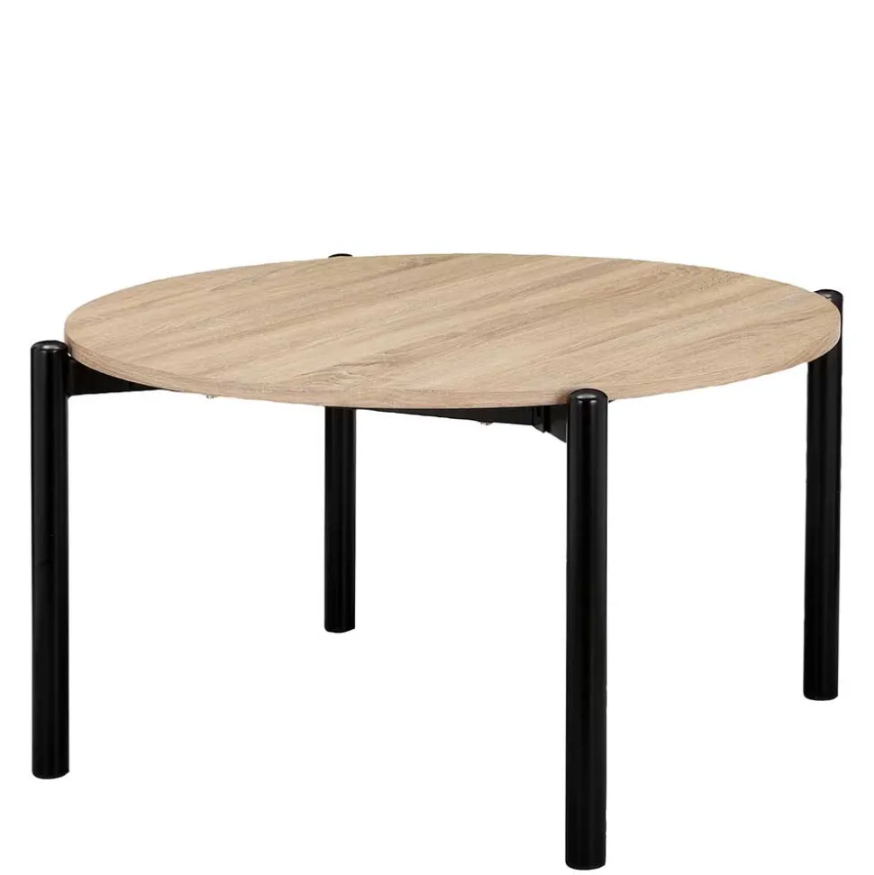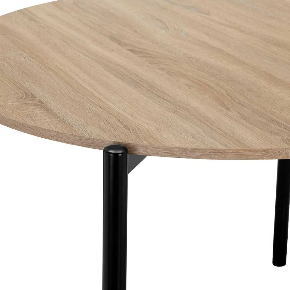 Der „Emrene“ Tisch überzeugt mit einer soliden Verarbeitung. Die runde Tischplatte besteht aus MDF und ist mit einer Folie in Wildeiche-Holzoptik versehen, die die natürliche Maserung des Holzes realistisch imitiert. Das stabile Metallgestell sorgt für sicheren Halt und verfügt über eine Pulverbeschichtung in mattschwarz, die dem Tisch nicht nur eine moderne, sondern auch eine widerstandsfähige Oberfläche verleiht. Die vier Tischbeine sind so gestaltet, dass sie sich oben leicht über die Tischplatte ziehen, was dem Tisch eine besonders markante und funktionale Form verleiht.