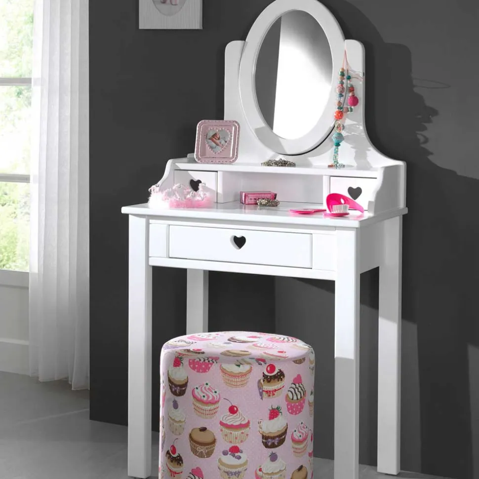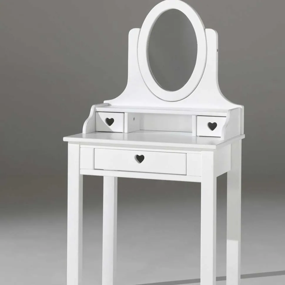 Sie suchen nach einer liebevoll gestalteten Frisierkommode für das Jugendzimmer? Der Spiegel Schminktisch Grandory ist die ideale Wahl! Mit seinem romantisch-modernen Design, das von herzförmigen Ausschnitten geprägt ist, verleiht er Ihrem Raum eine zauberhafte Atmosphäre. Die neutrale weiße Farbgebung sorgt dafür, dass sich dieses Möbelstück perfekt in jedes Raumkonzept einfügt und harmonisch mit nahezu allen anderen Möbeln und Einrichtungsgegenständen kombiniert werden kann.