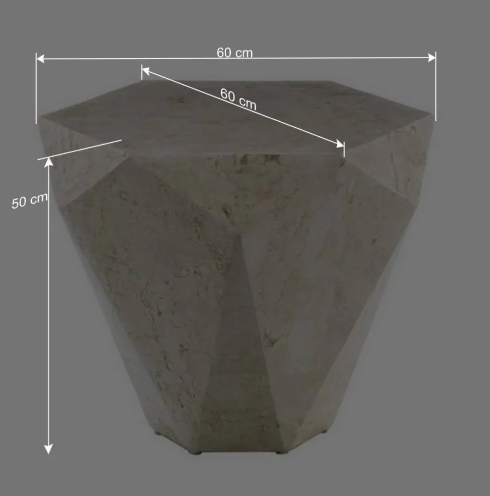 Mit Maßen von 60 cm Breite, 50 cm Höhe und 60 cm Tiefe in einer außergewöhnlichen sechseckigen Form, setzt der Couchtisch „Jevellon“ markante Akzente in Ihrem Wohnraum. Das Gewicht von ca. 30 kg und das standfeste Sockelgestell mit Bodenschonern garantieren dabei nicht nur eine beeindruckende Präsenz, sondern auch Langlebigkeit und Sicherheit.