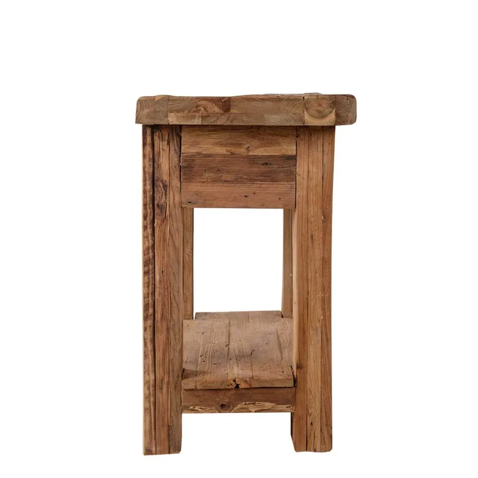 Die massive Tischplatte mit einer Dicke von 6 cm bietet nicht nur eine robuste und stabile Oberfläche, sondern auch ausreichend Platz für Ihre persönlichen Gegenstände. Ein Schubkasten auf rustikalem Holzauszug ermöglicht eine ordentliche Aufbewahrung von kleineren Dingen, während der Bügelgriff aus Metall in Antikoptik einen zusätzlichen Hauch von Vintage-Charme verleiht. Für noch mehr Stauraummöglichkeiten steht Ihnen eine zusätzliche Ablagefläche zur Verfügung, auf der Sie dekorative Elemente oder weitere Utensilien platzieren können.