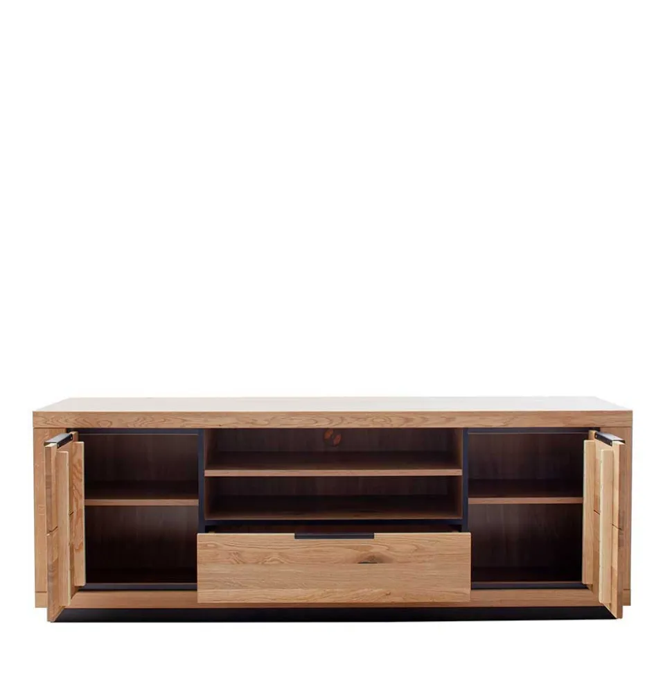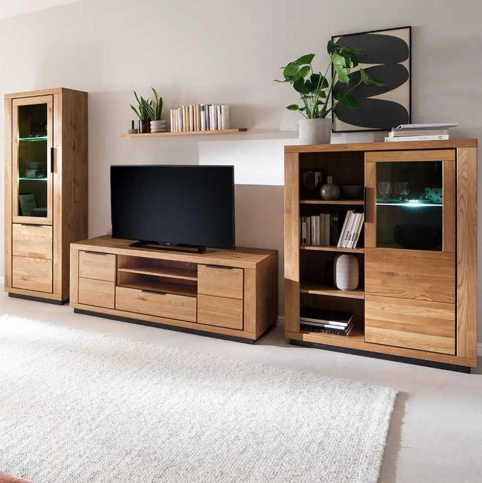 Mit ihrer warmen Wildeichefarbe und den kontrastierenden schwarzen Akzenten bringt die Wohnwand „Vlacoma“ ein angenehmes und gleichzeitig edles Ambiente in Ihr Zuhause. Die natürlich geölte Holzoberfläche mit durchgehenden Lamellen verleiht den Möbelstücken eine besonders hochwertige Optik und Haptik. Die Kombination aus Massivholz, MDF in Holzoptik foliert und Klarglas sorgt nicht nur für Stabilität und Langlebigkeit, sondern auch für eine ansprechende ästhetische Wirkung. Massivholz überzeugt durch seine Robustheit und natürliche Maserung, während MDF als Trägermaterial für die Holzoptik-Folie eine gleichmäßige Struktur bietet. Klarglas-Elemente runden das moderne Design ab und schaffen zusätzliche Leichtigkeit.