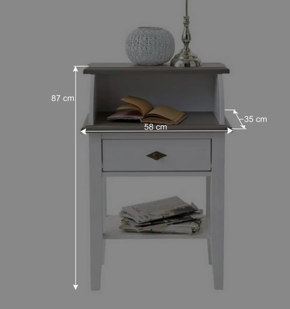 Mit den Maßen 58 cm Breite, 87 cm Höhe und 35 cm Tiefe bietet der Tisch praktischen Stauraum, ohne viel Platz einzunehmen. Ob Telefon, Bücher oder Deko-Elemente – hier findet alles seinen Platz. Das offene Fach auf der Tischplatte, die Ablage im unteren Bereich und der Schubkasten mit leichtgängigem Metallauszug bieten übersichtlichen und leicht zugänglichen Stauraum. Der attraktive Knopfgriff in Altmessingfarben an der Schublade setzt dabei einen edlen Akzent.