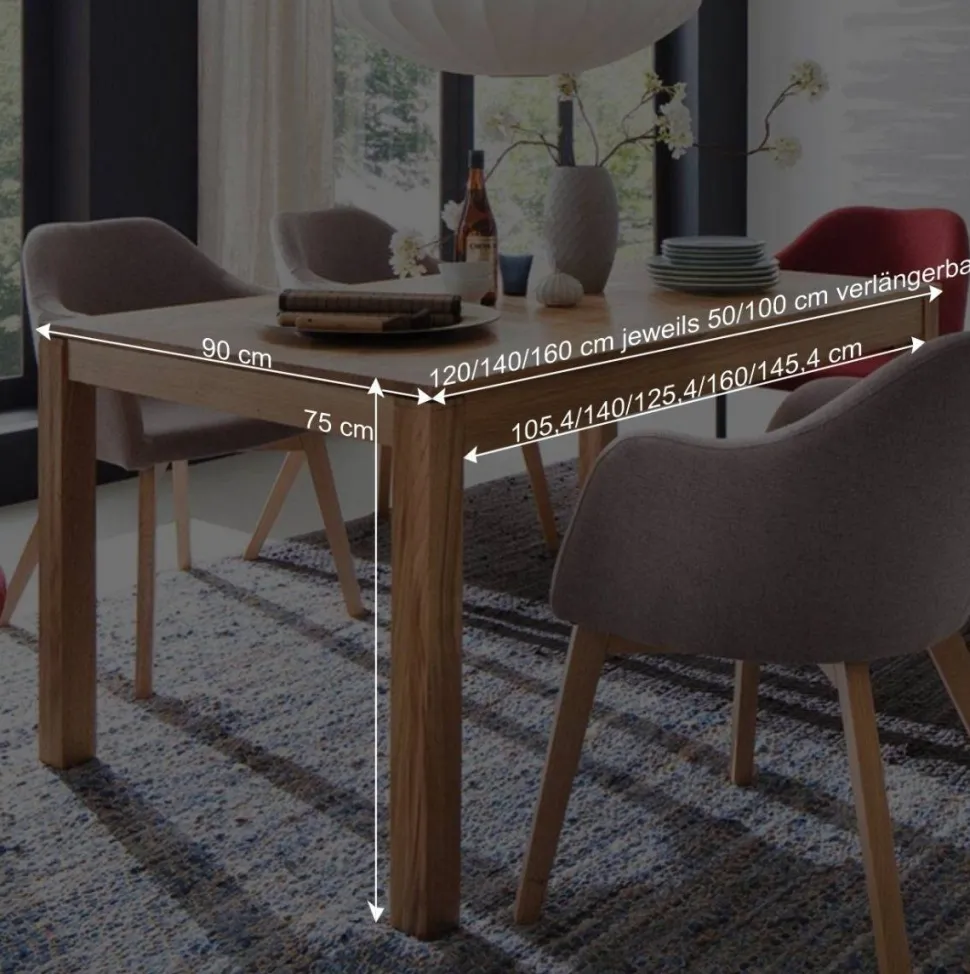 Der Tisch verfügt über eine solide Tischplattenstärke von ca. 2 cm und ist stabverleimt, um maximale Stabilität zu gewährleisten. Das starke Massivholz-Vierfußgestell mit Tischbeinen von ca. 7×7 cm sorgt für zusätzliche Stabilität und Unterstützung. Der Abstand vom Boden bis zur Unterkante der Zarge beträgt ca. 64,5 cm, während der Abstand zwischen den Tischbeinen an der Längsseite bei einer Breite von 120 cm ca. 105,4 cm, bei 140 cm ca. 125,4 cm und bei 160 cm ca. 145,4 cm beträgt.