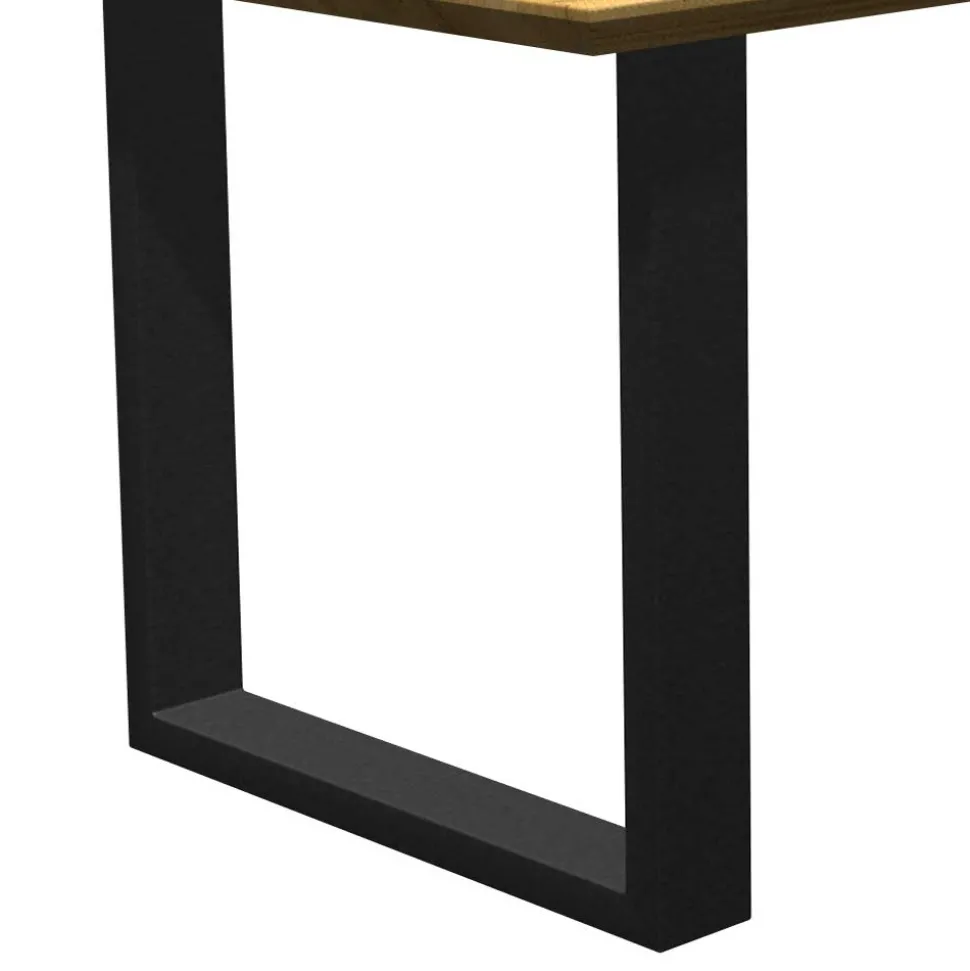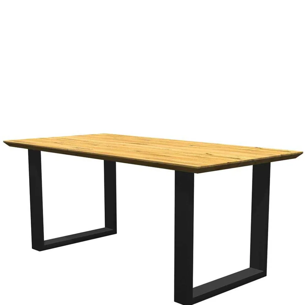 Die etwa 4 cm starke Eichenplatte des Tisches Blacer ist aufwendig mit Schweizer Kante gearbeitet. Sie wird durch ein solides Metallgestell in Form von zwei U-Füßen sicher und stabil getragen.