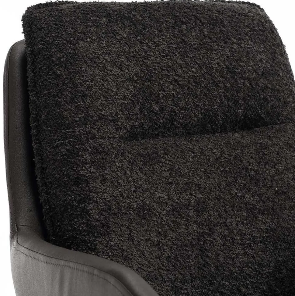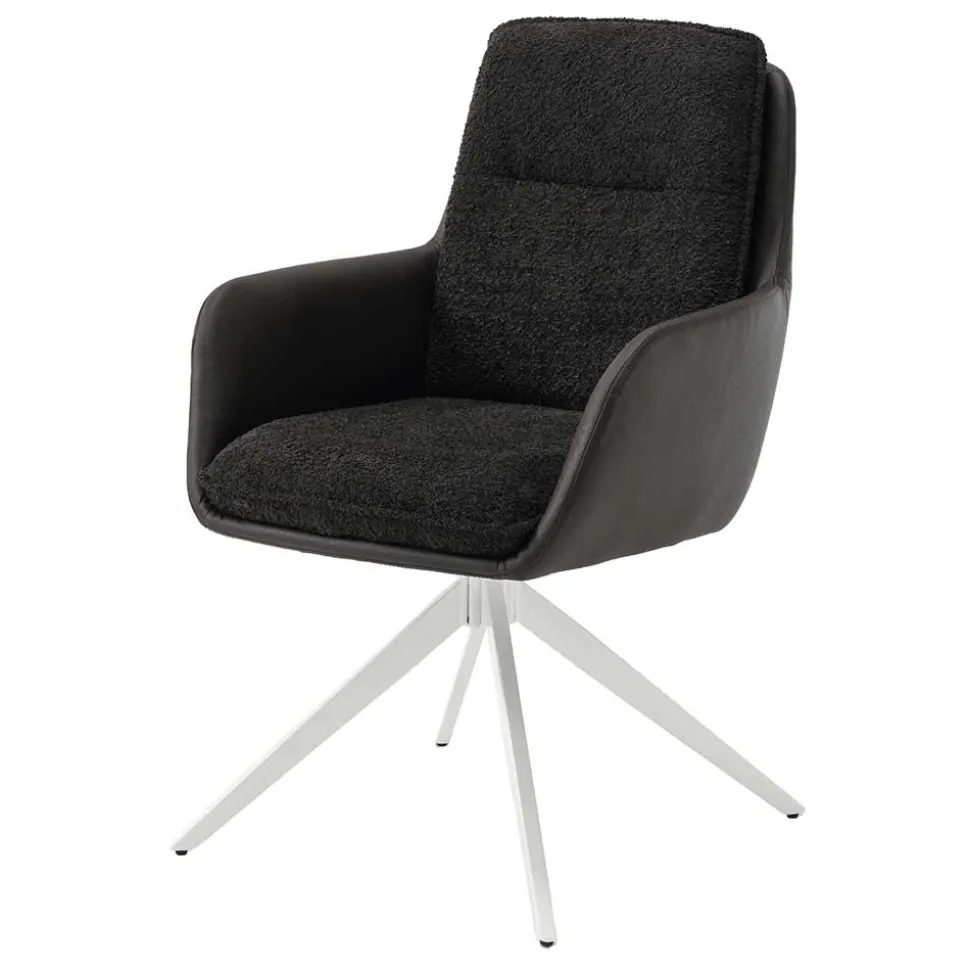 Hergestellt aus strapazierfähigem, anthrazitfarbenem Boucle-Bezug und ergänzt durch Kunstleder an den Armlehnen und der Außenseite, bietet der „Garrysa“ eine luxuriöse Oberflächenbeschaffenheit. Boucle ist bekannt für seine weiche, texturierte und dabei enorm widerstandsfähige Qualität, was den Stuhl besonders pflegeleicht macht. Das Kunstleder ergänzt mit seiner glatten, eleganten Optik und bietet eine ideale Kombination für den täglichen Gebrauch und besondere Anlässe.