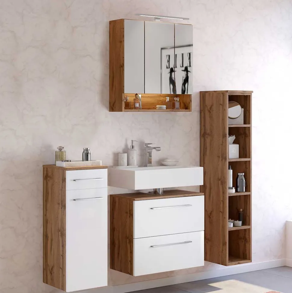 Gefertigt aus robustem MDF für die Fronten und stabiler Spanplatte für die Korpusse, steht Yazemina für langlebige Beständigkeit. Das verwendete Spiegelglas sorgt im Spiegelschrank für eine brillante Reflexion. Die melaminbeschichteten Korpusse und Böden in Wildeiche-Optik sind nicht nur pflegeleicht, sondern auch widerstandsfähig gegen Feuchtigkeit und Kratzer – ideal für den Alltag im Bad. Die mattweißen Fronten sind foliert, was sie zusätzlich vor Aufquellen und Verschmutzung schützt.