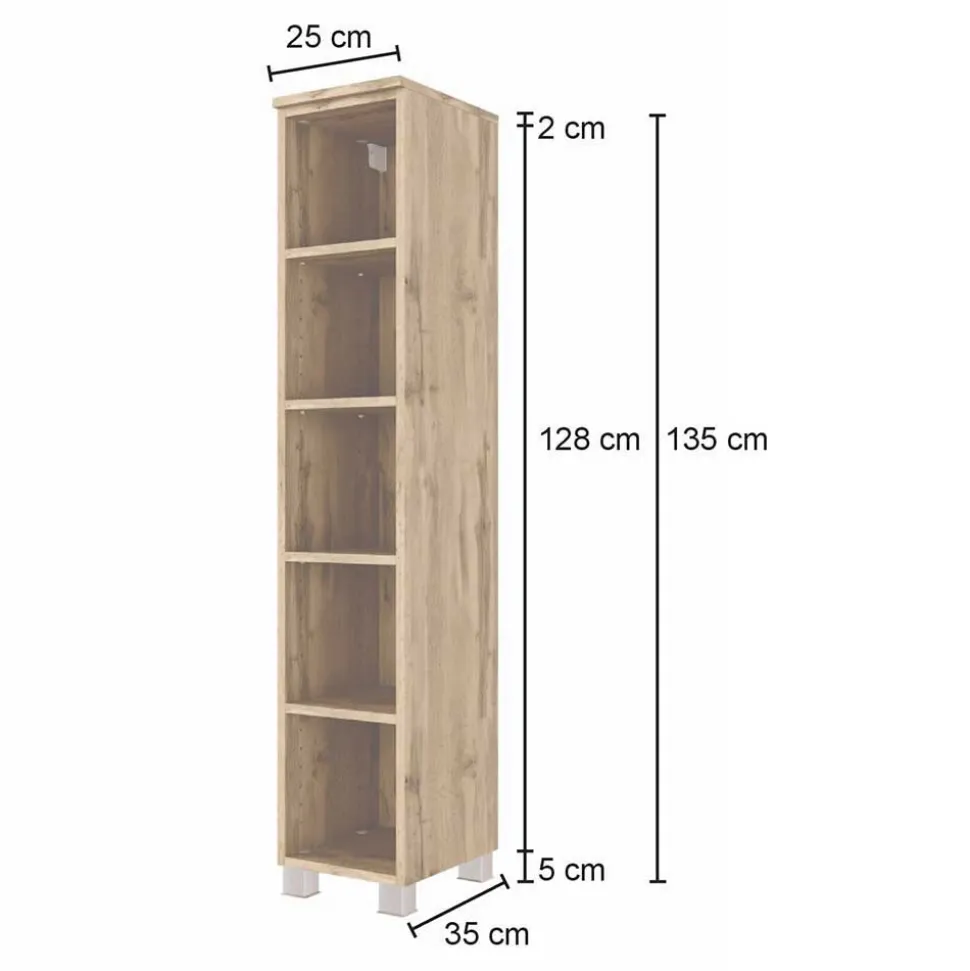 Mit Maßen von 25x130x35 cm (BxHxT) bietet das hohe Regal vier Einlegeböden für Handtücher, Pflegeprodukte oder Dekoration – stets griffbereit und stilvoll verstaut.
