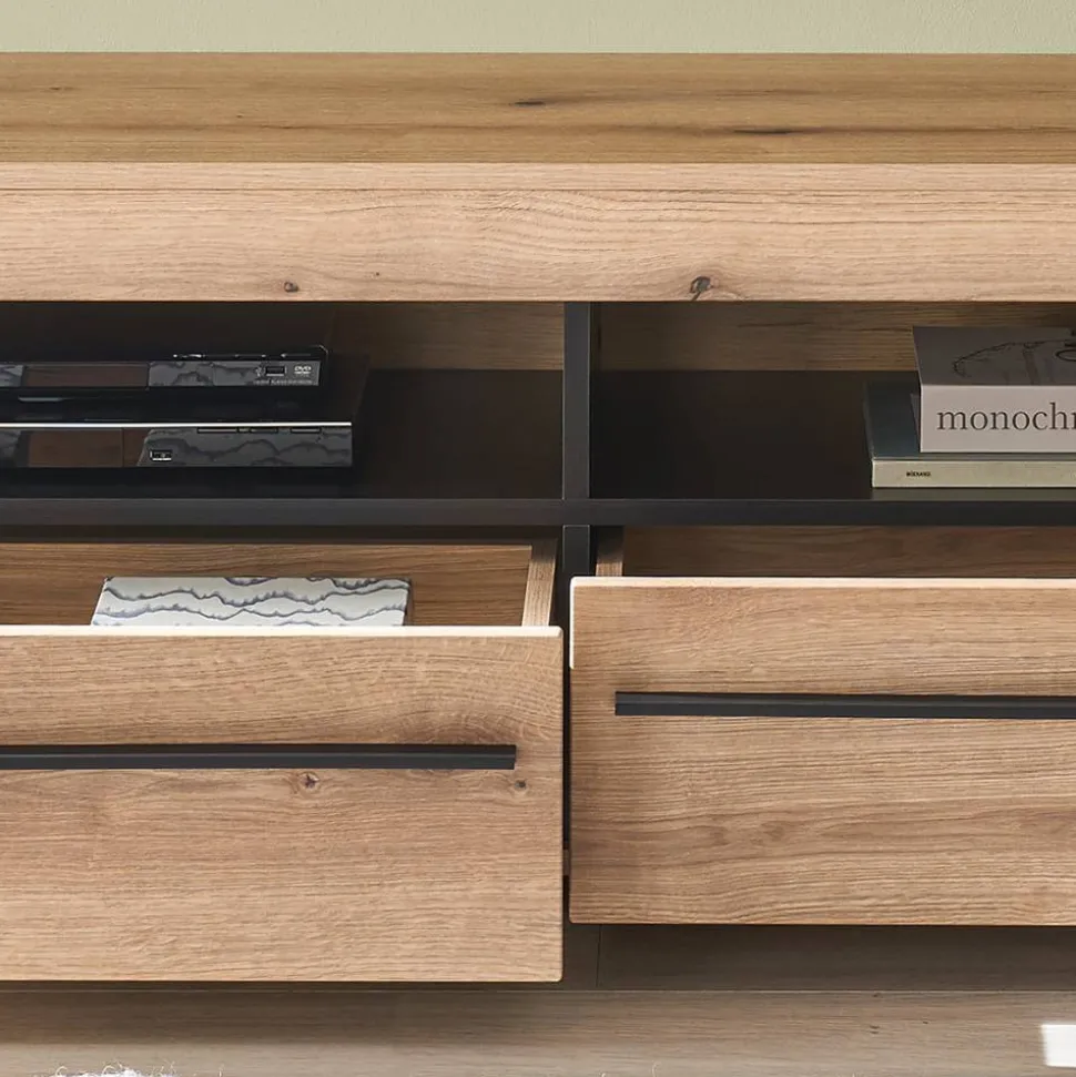 Das Set besteht aus einem stilvollen TV-Lowboard, einem imposanten Highboard, einer edlen Standvitrine und einem formvollendeten Wandboard. Zusammen erschaffen sie ein durchdachtes Gesamtkonzept, das Wohnästhetik neu definiert. Hier trifft klare Linienführung auf natürliche Holzoptik – ein Zusammenspiel, das Wärme ausstrahlt und gleichzeitig modern wirkt. Jeder Raum profitiert von der stimmigen Präsenz dieser Möbel.