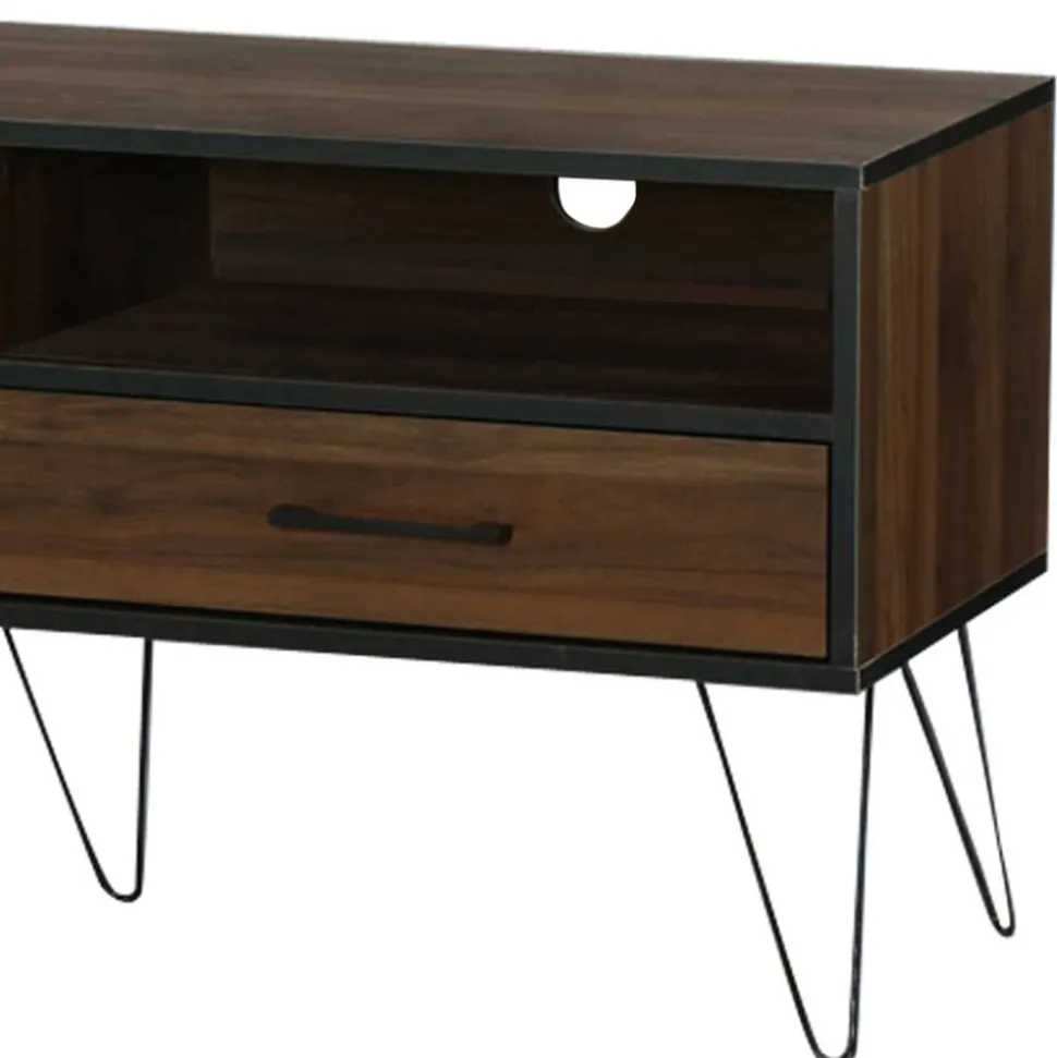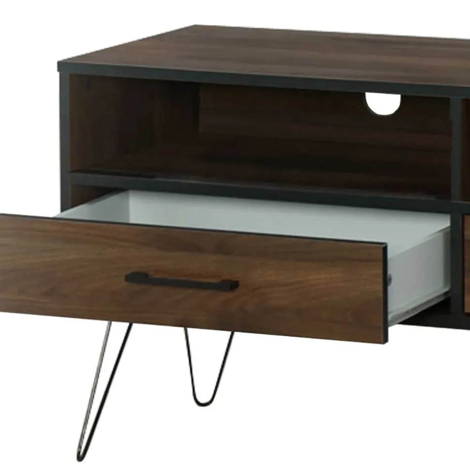 Mit dem TV Board „Hamidy“ holen Sie sich ein kompaktes Möbelstück mit moderner Eleganz und funktionalen Details in Ihr Zuhause. Die Farbkombination aus Braun und Schwarz sowie die filigrane Hairpinform des Metallgestells verleihen dem Board eine charmante Retro-Optik. Dank der durchdachten Gestaltung bietet es nicht nur Platz für Ihre Mediengeräte, sondern auch praktischen Stauraum für Zubehör.
