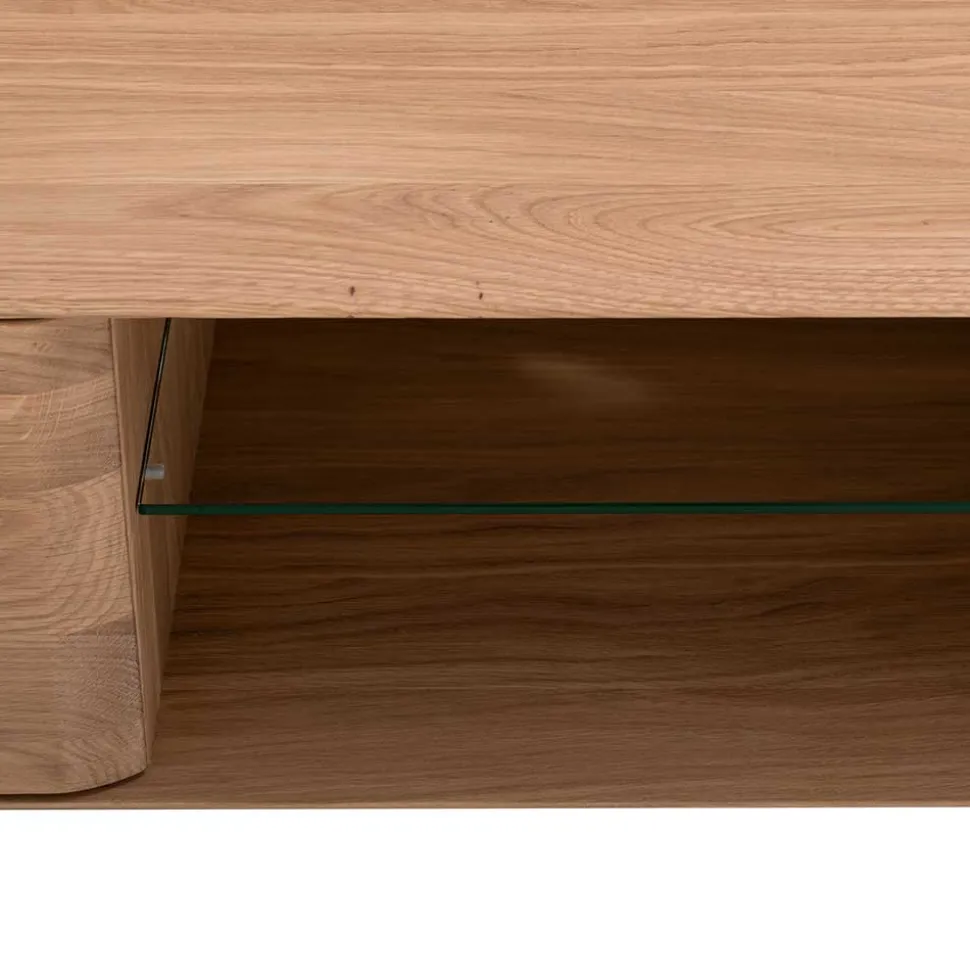 Im Zentrum des Unterschranks finden Sie ein offenes Gerätefach, geteilt durch einen eleganten Glasboden – ideal, um Ihren Receiver und weitere Geräte stilvoll zu präsentieren und dennoch griffbereit zu haben. Kabelsalat gehört der Vergangenheit an: Eine vorgefertigte Öffnung zur Kabelführung in der Rückwand sorgt für Ordnung und ein aufgeräumtes Erscheinungsbild.