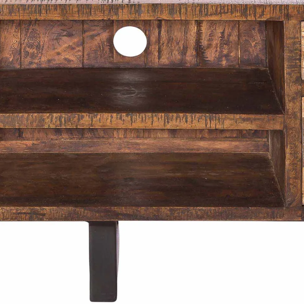 Das TV-Lowboard „Bahiro“ ist nicht nur ein funktionales Möbelstück, sondern auch ein ästhetisches Statement für Ihren Wohnraum. Gefertigt aus recyceltem Mangobaumholz und robustem Metall, vereint es die rustikale Schönheit von Holz mit der industriellen Eleganz von Metall.