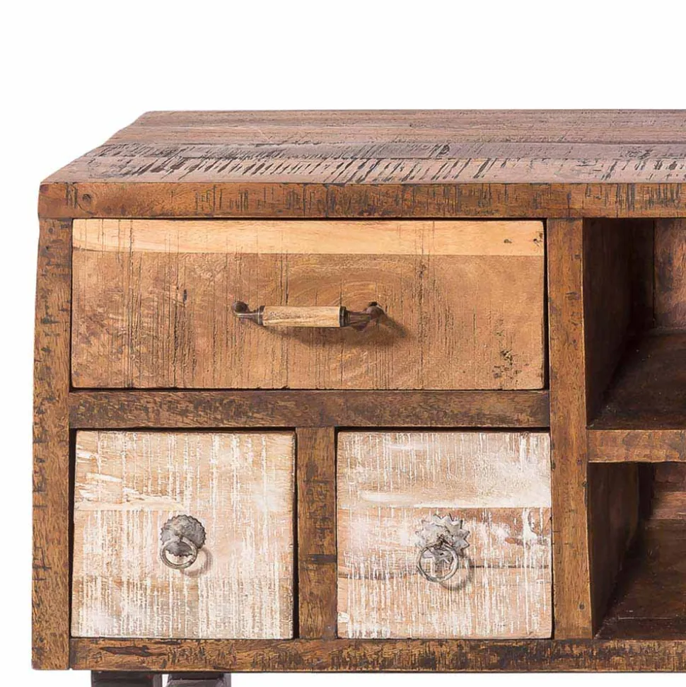 Das verwendete Mangobaumholz ist nicht nur umweltfreundlich, sondern auch von Natur aus robust und langlebig. Durch die Verwendung von recyceltem Holz wird nicht nur die Umwelt geschont, sondern auch jedem Möbelstück eine einzigartige Geschichte und Ausstrahlung verliehen. Die raue Oberfläche des Holzes ist mit einem Antikfinish lackiert, das seine natürliche Maserung betont und ihm einen charmanten Vintage-Look verleiht.