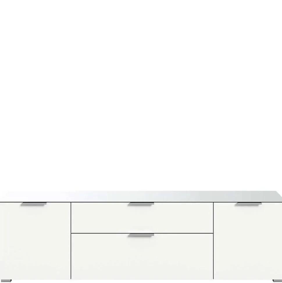 Gefertigt aus robuster Spanplatte, punktet das TV-Element durch seine langlebige Verarbeitung. Die Deckplatte mit weißem Siebdruckglas (3 mm Stärke) verleiht dem Möbel nicht nur optische Raffinesse, sondern schützt auch die Oberfläche zuverlässig. Dezente Aluminium-Kantengriffe fügen sich unauffällig in das Gesamtbild ein, während silberfarbene Kunststoff-Bodengleiter für einen sicheren Stand sorgen.