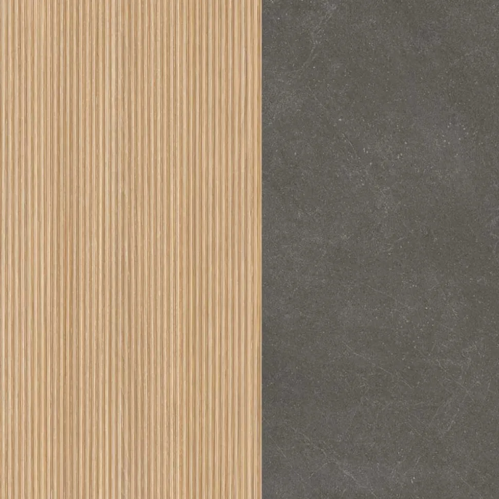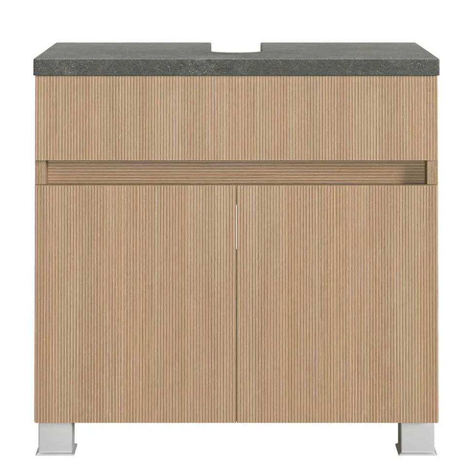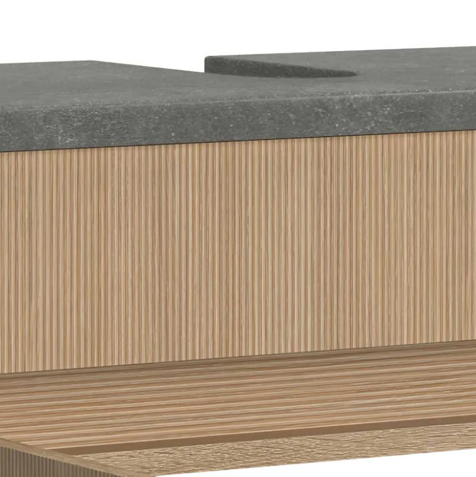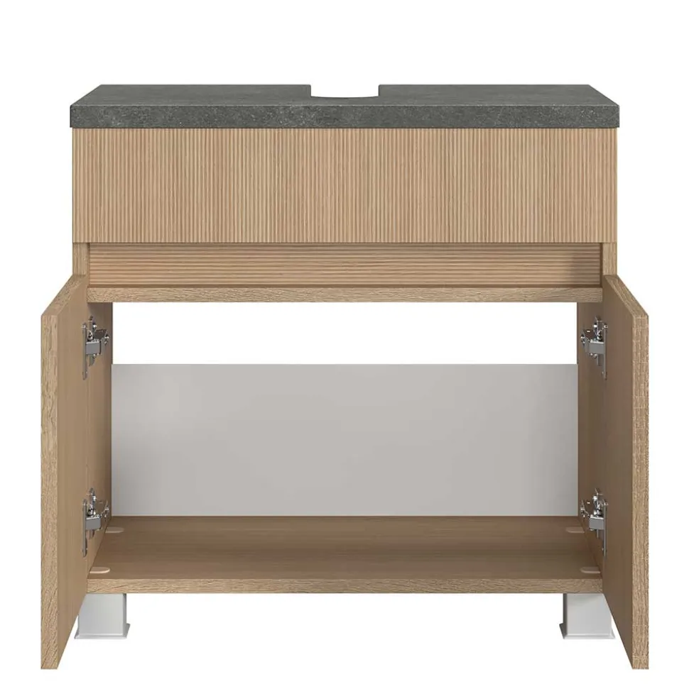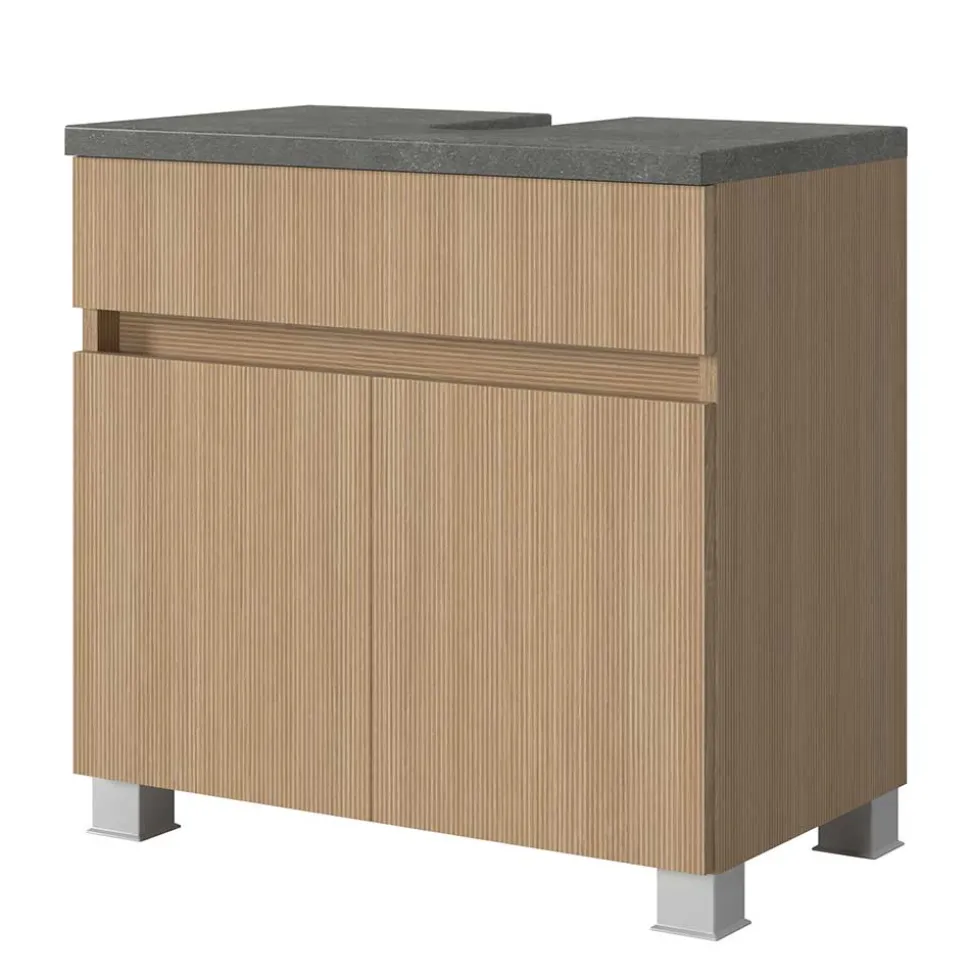 Bringen Sie mehr Struktur und Wärme in Ihr Badezimmer mit dem Unterbeckenschrank „Leitha“. Die helle Eichenholz-Optik mit fühlbarer Struktur verleiht Ihrem Raum ein wohnliches Flair, während die dunkelgraue Deckplatte in markanter Steinoptik einen stilvollen Kontrast setzt. Dank seines funktionalen Designs ist dieser Schrank die perfekte Ergänzung für Ihr Waschbecken – ideal, um Reinigungsutensilien oder Pflegeprodukte ordentlich zu verstauen. Gefertigt in Deutschland, überzeugt er mit hoher Verarbeitungsqualität und langlebigen Materialien.