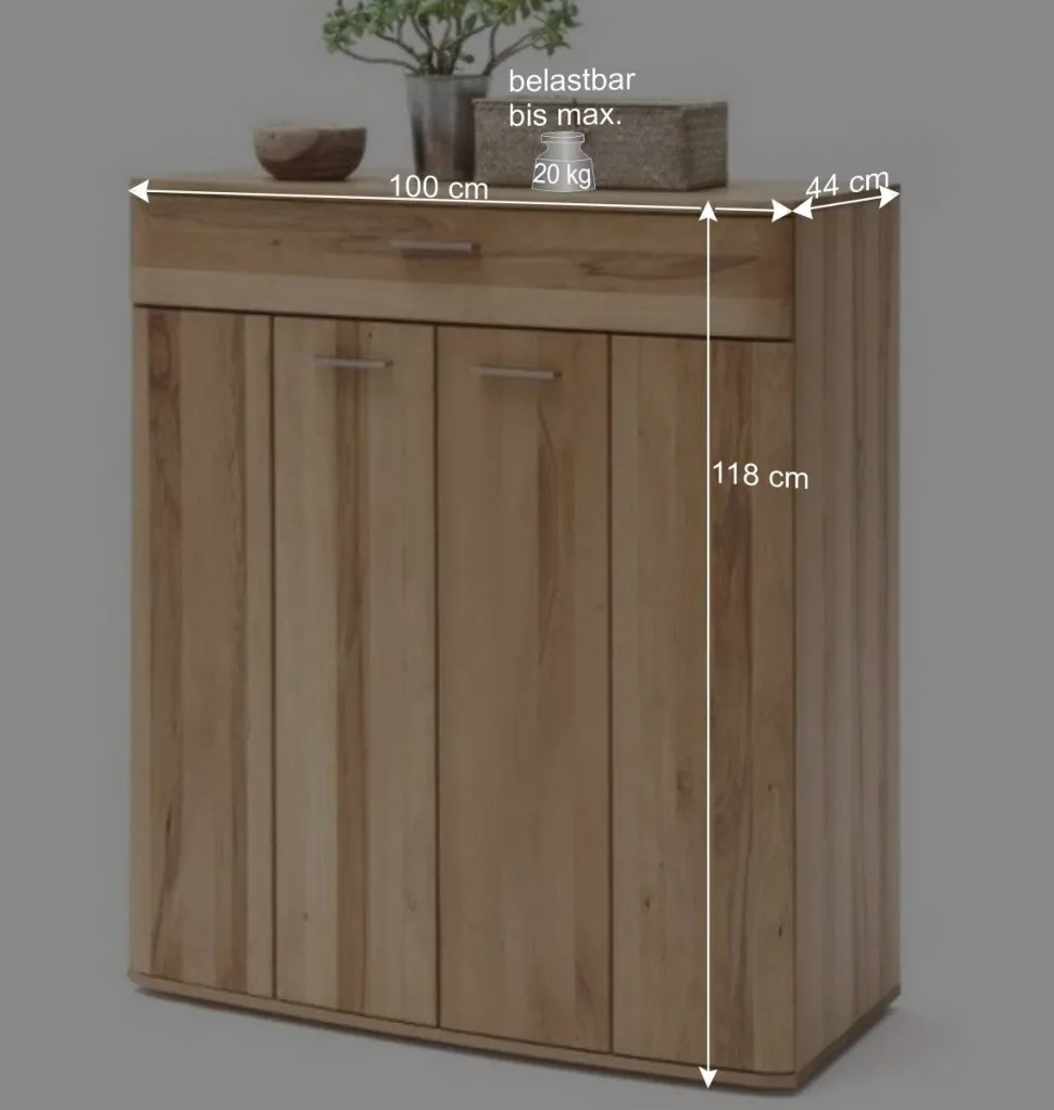 Das Vertiko „Hippa“ besticht durch eine klare, moderne Linienführung und den warmen Farbton der Kernbuche. Dieses Möbelstück bietet mit seiner kompakten Größe von 100 cm Breite, 118 cm Höhe und 44 cm Tiefe großzügigen Stauraum, der sich ideal in verschiedenste Wohnbereiche einfügt – vom Flur bis ins Wohnzimmer.