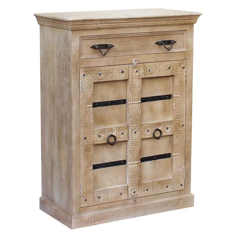 Unser Schuhschrank „Abid“ zeichnet sich durch hervorragende Material- und Verarbeitungsqualität aus. Die überstehende Deckplatte ist aufwändig gefräst und verleiht dem Schrank eine markante Präsenz. Die reich verzierte Front ist mit plastischen Strukturen und Nieten sowie Beschlägen aus Metall verziert, was ihn zu einem wahren Blickfang macht.