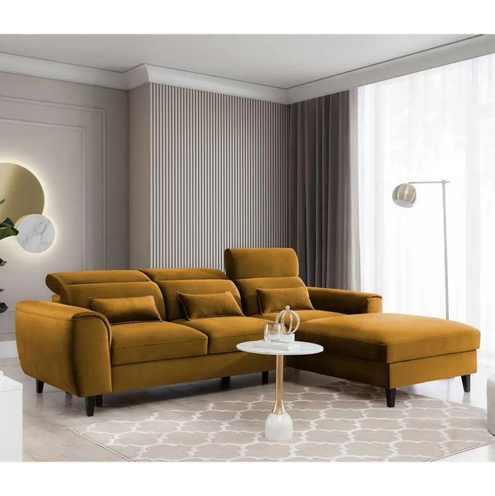 Der weiche Samt-Bezug in Senfgelb nicht nur ein optischer Blickfang, sondern auch außerordentlich strapazierfähig. Mit einer Strapazierfähigkeit von 100.000 Scheuertouren nach Martindale und einer Lichtechtheit von Stufe 5, bleibt die Farbbrillanz auch bei Sonneneinstrahlung erhalten. Die Couch ist zudem frei im Raum stellbar dank des echt bezogenen Rückens und bietet individuell einstellbare Kopfstützen für zusätzlichen Komfort.