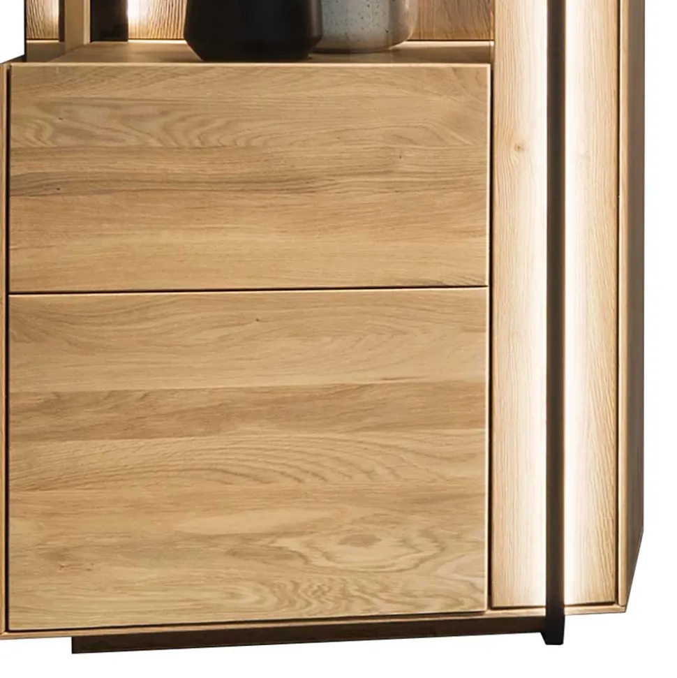 Die Standvitrine „Slaraduva“ ist aus massiver Asteiche gefertigt, einem Holz, das für seine Robustheit, Langlebigkeit und seine auffallend attraktive Maserung bekannt ist. Die natürlich gewachsene Form der Asteiche, die durchgehende Lamellenstruktur des Holzes, sowie seine einzigartige Musterung verleihen jedem Möbelstück ein individuelles Aussehen. Gleichzeitig stellt die Asteiche sicher, dass Ihre Vitrine trotz täglicher Nutzung und Beanspruchung ihre Schönheit beibehält. Zusammen mit dem Glas entsteht ein spannender Materialmix, der modernes und natürliches Design miteinander verbindet.