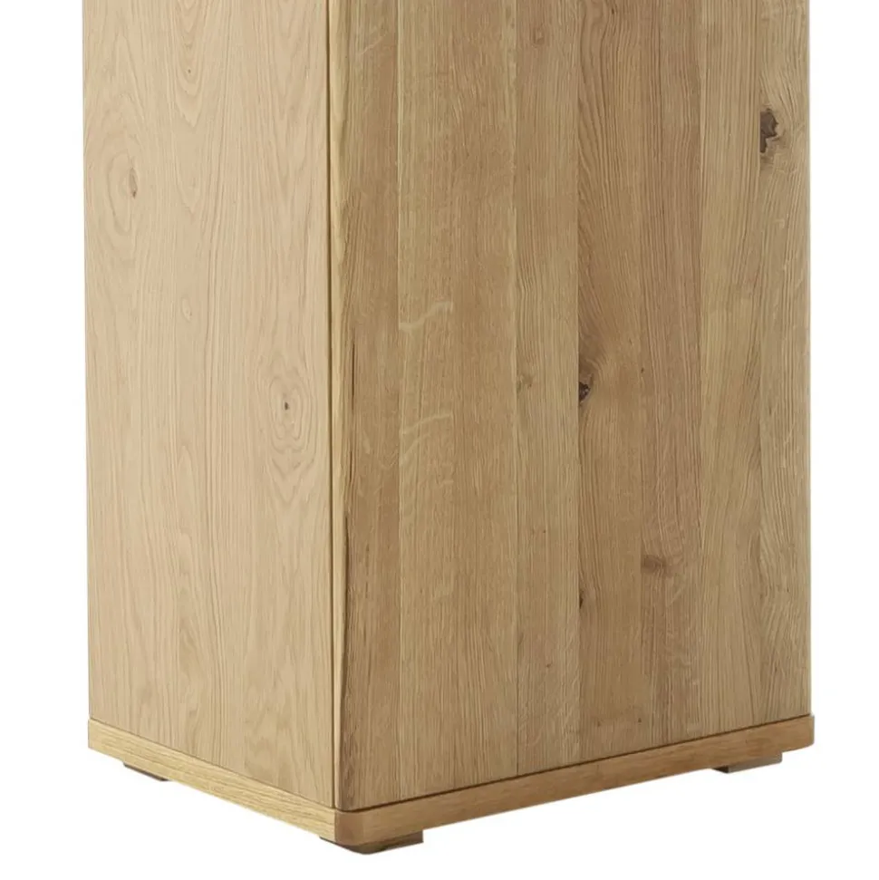 Die Front aus Massivholz mit durchgehender Lamelle strahlt natürliche Wärme aus und fasziniert mit einer lebendigen Maserung, die Sie bei jeder Berührung spüren können. Die geölte Oberfläche betont den authentischen Holzcharakter und verleiht der Vitrine eine angenehm samtige Haptik. Der furnierte Spanplattkorpus verbindet elegantes Design mit hoher Stabilität, während die innere Beschichtung in hochwertiger Holzoptik die edle Erscheinung bis ins Innere fortsetzt. Diese Materialkombination sorgt nicht nur für ein harmonisches Gesamtbild, sondern steht zugleich für langlebige Qualität, die Sie jeden Tag aufs Neue genießen werden.