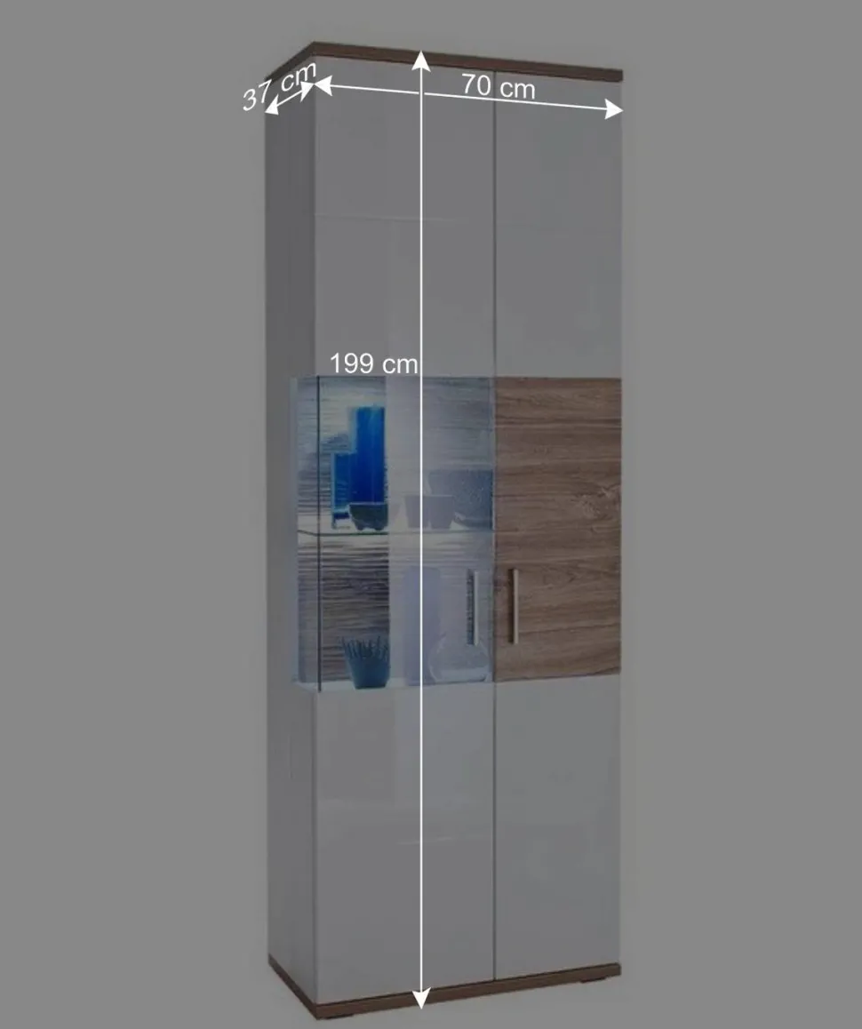 Mit einer Breite von 70 cm, einer Höhe von 199 cm und einer Tiefe von 37 cm bietet die Vitrine „Icadro“ ausreichend Stauraum für Ihre persönlichen Schätze. Die beiden Türen sind mit langlebigen Metallscharnieren ausgestattet und ermöglichen einen bequemen Zugang zu Ihrem Inventar.
