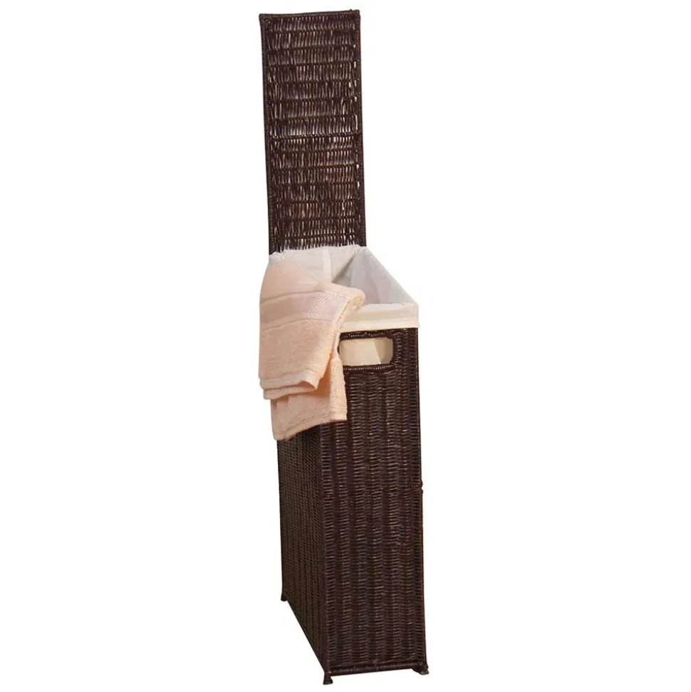 Der Wäschesammler „Orgenzy“ überzeugt mit stilvollem Design in Dunkelbraun und einer besonders schmalen Bauweise, die ihn zur idealen Wahl für platzsparende Lösungen im Bad, Schlafzimmer oder der Waschküche macht. Mit einer Breite von nur 16 cm fügt er sich mühelos in kleine Nischen ein und sieht dabei auch noch gut aus.
