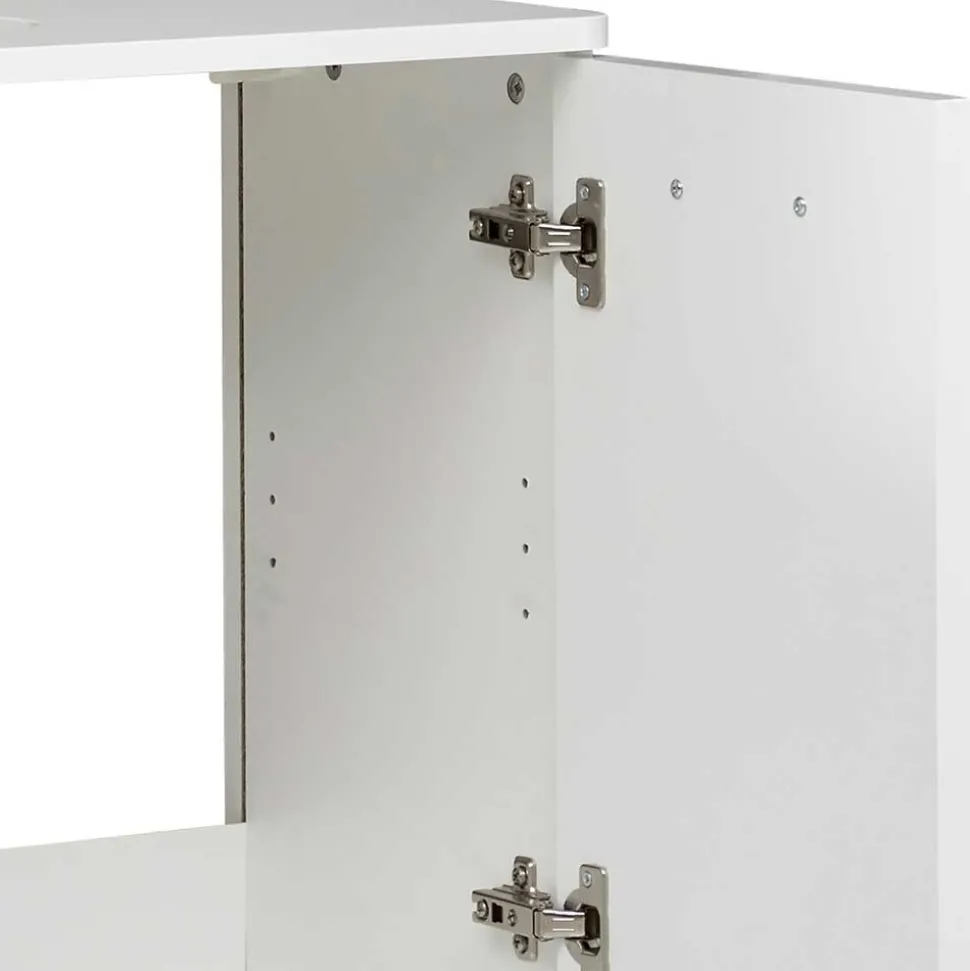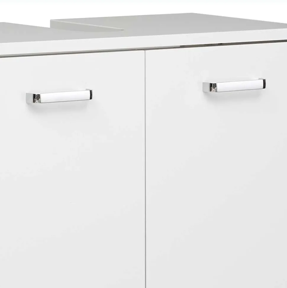 Der Waschbeckenschrank „Yennja“ überzeugt mit einer praktischen Doppeltür, die mit hochwertigen Metallbeschlägen und einer Soft-Close-Funktion ausgestattet ist. So schließen die Türen sanft und geräuschlos. Der großzügige Innenraum hinter den Türen bietet viel Platz für Ihre Badutensilien, während die offene Rückwand eine unkomplizierte Installation der Wasserleitungen ermöglicht. Darüber hinaus wurde in der Deckplatte bereits ein Ausschnitt für den Siphon eingearbeitet – eine durchdachte Lösung für den schnellen Aufbau. Der Schrank lässt sich sowohl hängend als auch stehend aufstellen. Bei der stehenden Variante kommen vier Füße in glänzender Chrom-Optik zum Einsatz, die dem Möbelstück zusätzlich Stabilität verleihen.