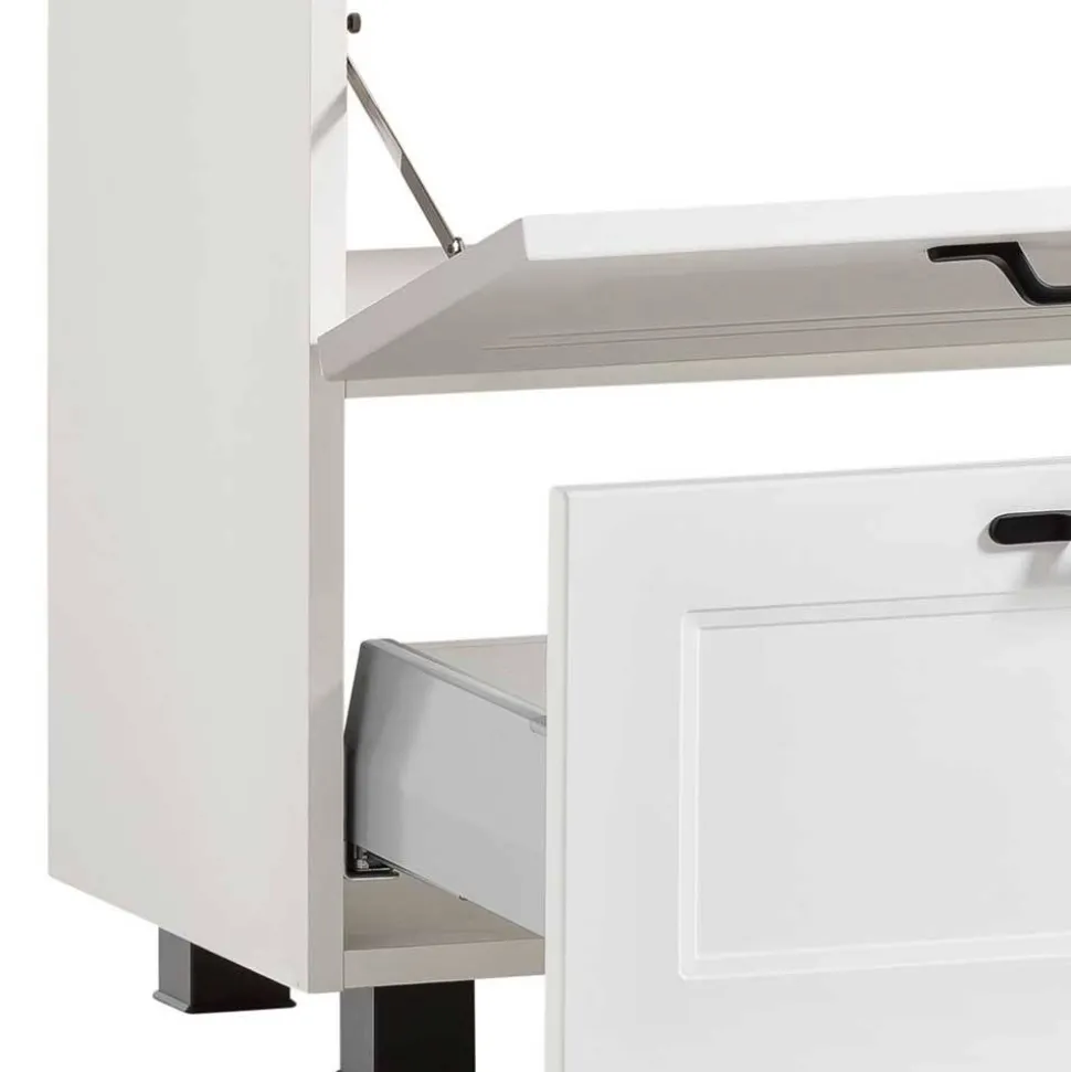 „Gyatso“ bietet durchdachten Stauraum für Ihre Badutensilien. Eine Schublade mit Metallauszug und Soft-Close-Funktion sorgt für sanftes und leises Schließen. Darüber befindet sich eine Klappe mit gedämpften Metallbeschlägen, die zusätzlichen Platz für Handtücher oder Hygieneartikel bietet. Der Siphon-Ausschnitt in der Deckplatte und im Klappenboden macht die Integration mit Ihrem Waschbecken einfach und unkompliziert. Dank der mitgelieferten Kunststoff-Füße (Höhe 5 cm) können Sie den Schrank sowohl stehend verwenden als auch platzsparend an der Wand montieren.
