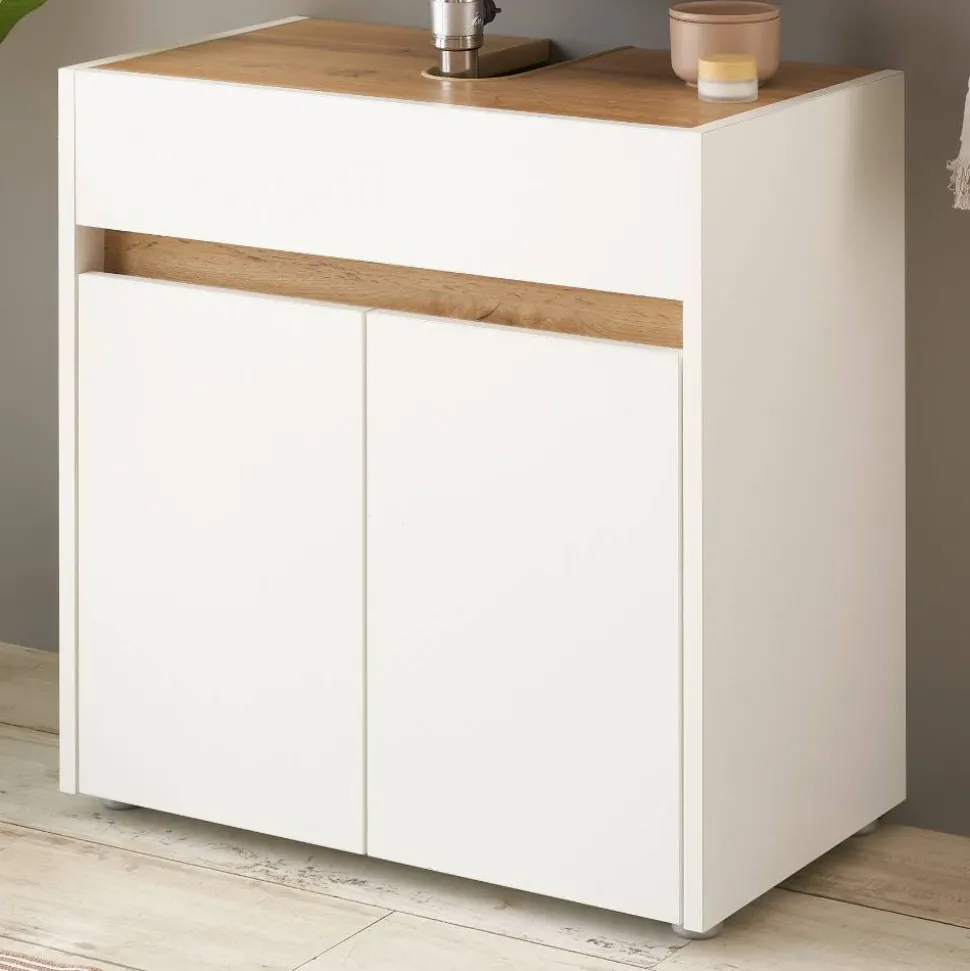 Der Waschbeckenunterschrank „Nonessia“ bringt frische Klarheit ins Badezimmer. Die weiße Front wirkt zurückhaltend und freundlich, während die leicht zurückgesetzte Blende in Wildeiche-Optik einen warmen Akzent setzt – zugleich Griffmulde und Designelement. Das Ergebnis: ein Möbelstück, das Ruhe ausstrahlt und sich mühelos in helle Raumkonzepte einfügt.