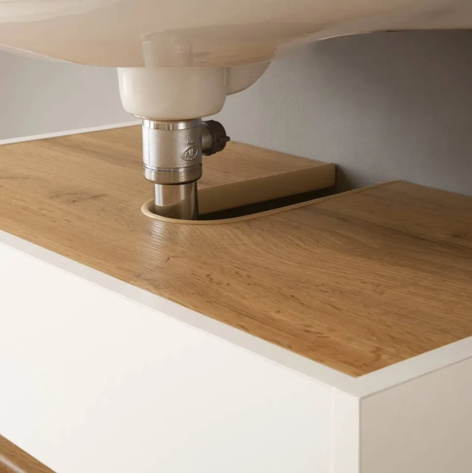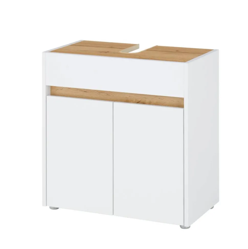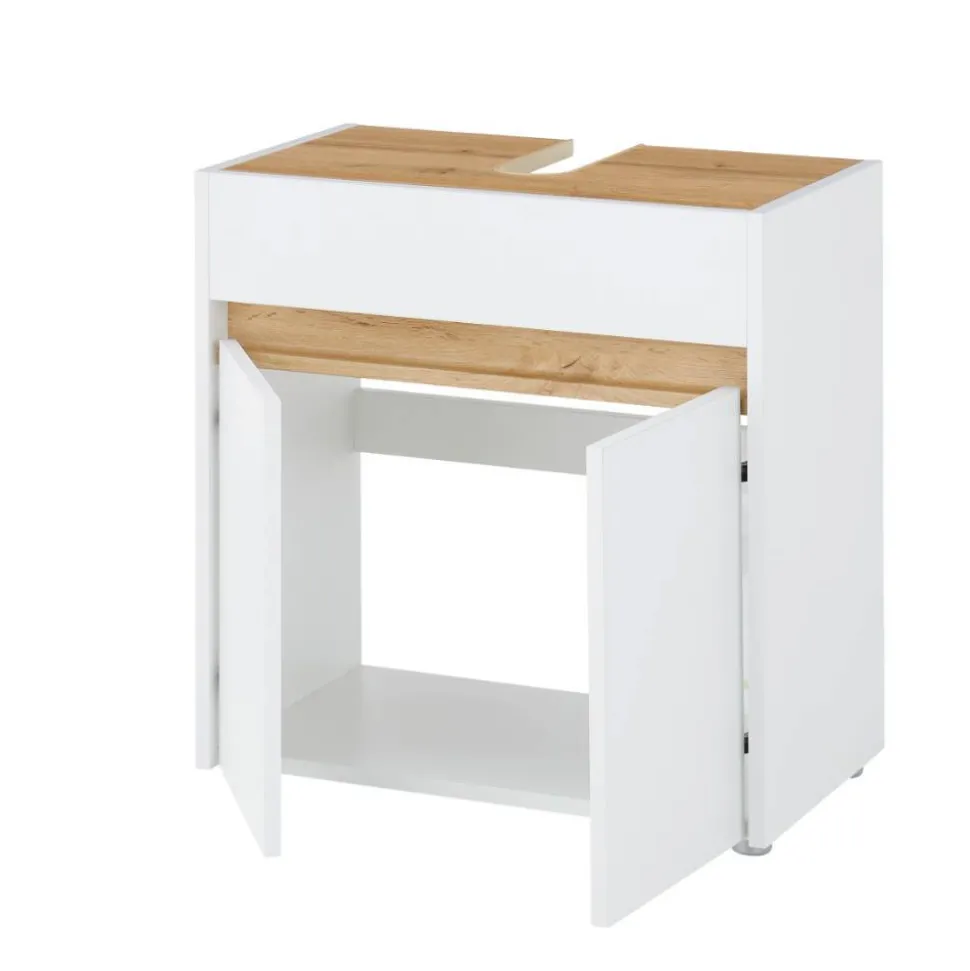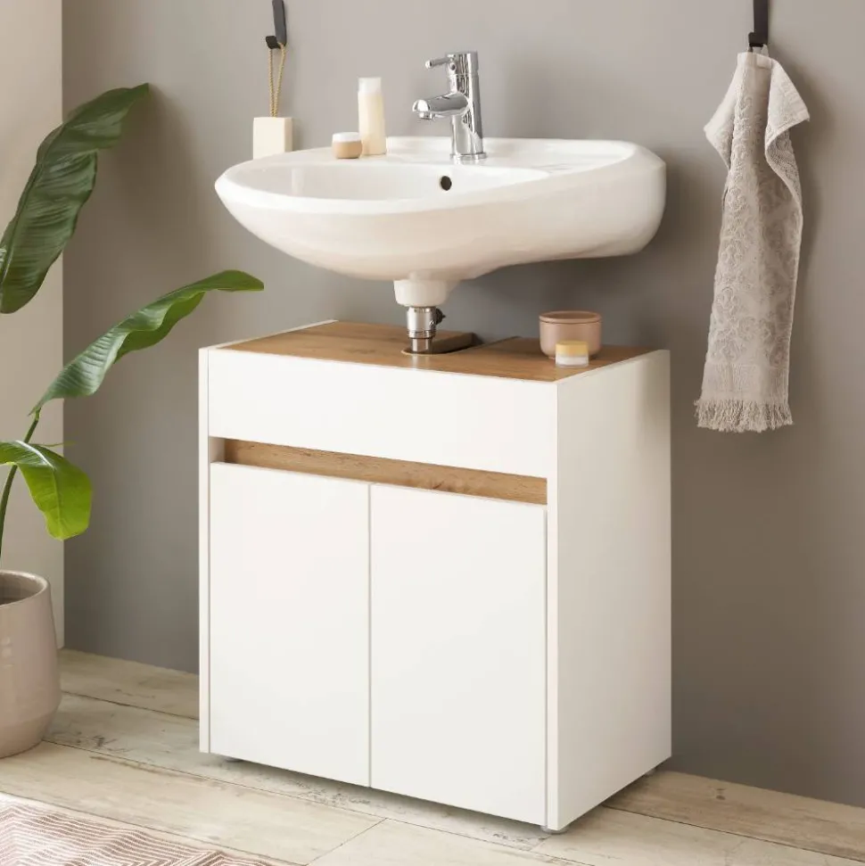 - Praktischer Waschbeckenunterschrank in Weiß und Wildeichefarben