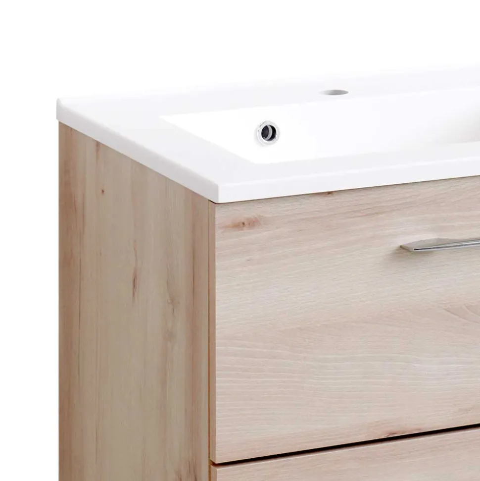 Hinter der attraktiven Holzoptik verbirgt sich eine rundum funktionale Konstruktion aus robuster Spanplatte. Dieses Material ist nicht nur stabil, sondern auch besonders formbeständig – ein Vorteil, der sich im feuchten Badezimmerklima bezahlt macht. Alle Oberflächen sind mit einer hochwertigen Melaminbeschichtung veredelt, die das Möbelstück widerstandsfähig gegenüber Kratzern, Feuchtigkeit und Hitze macht. Diese pflegeleichte Versiegelung sorgt dafür, dass der Waschtisch auch nach Jahren der Nutzung nichts von seiner Schönheit verliert. Selbst bei häufiger Reinigung bleibt die Oberfläche makellos und ansprechend – für ein Badezimmer, das dauerhaft einladend wirkt.