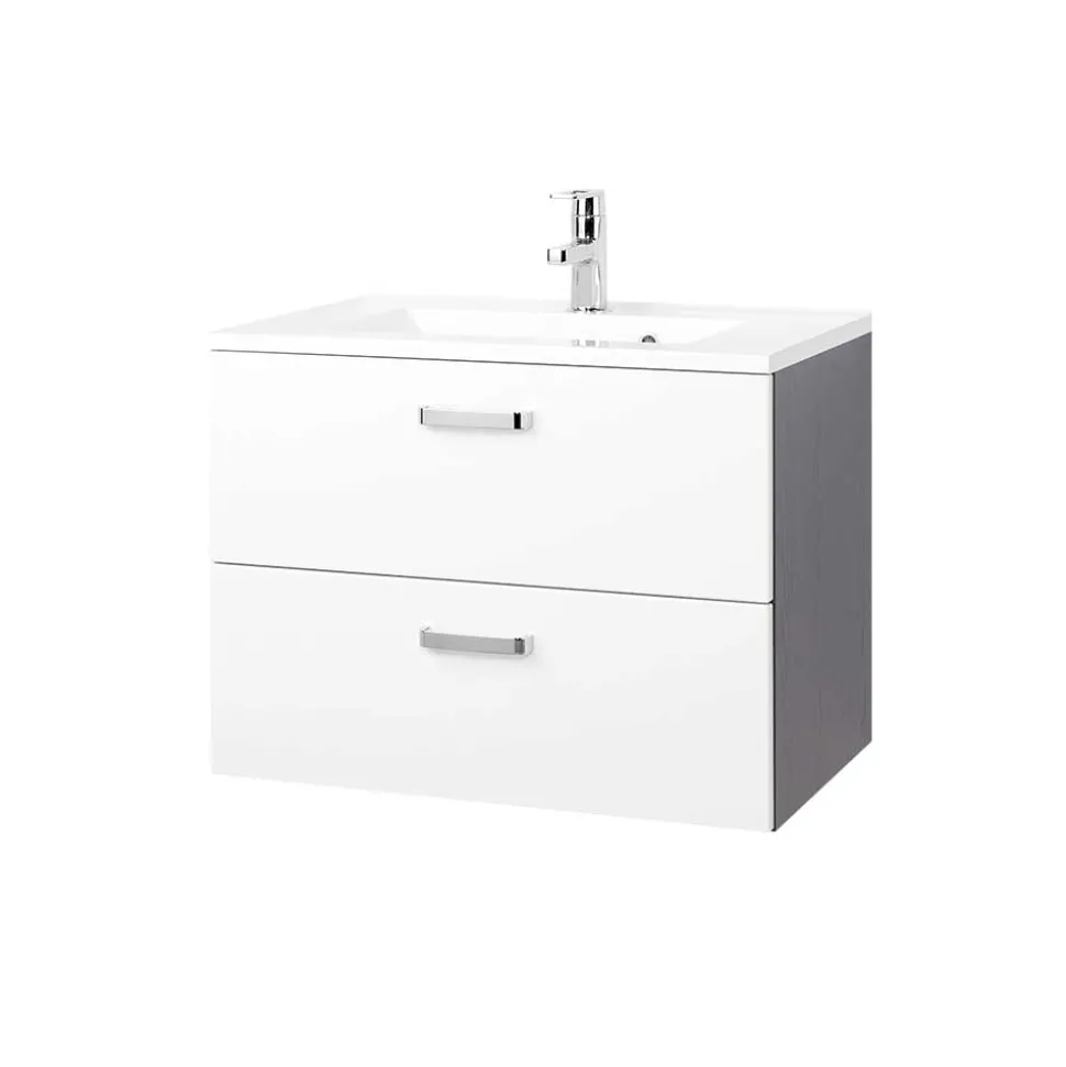 Elegante Metallgriffe setzen optische Akzente und runden das moderne Erscheinungsbild ab. Durch die praktische Wandmontage entsteht ein freischwebender Look, der nicht nur modern wirkt, sondern auch das Reinigen des Bodens erleichtert. Der Waschtisch wird zerlegt geliefert – eine leicht verständliche Montageanleitung liegt selbstverständlich bei.
