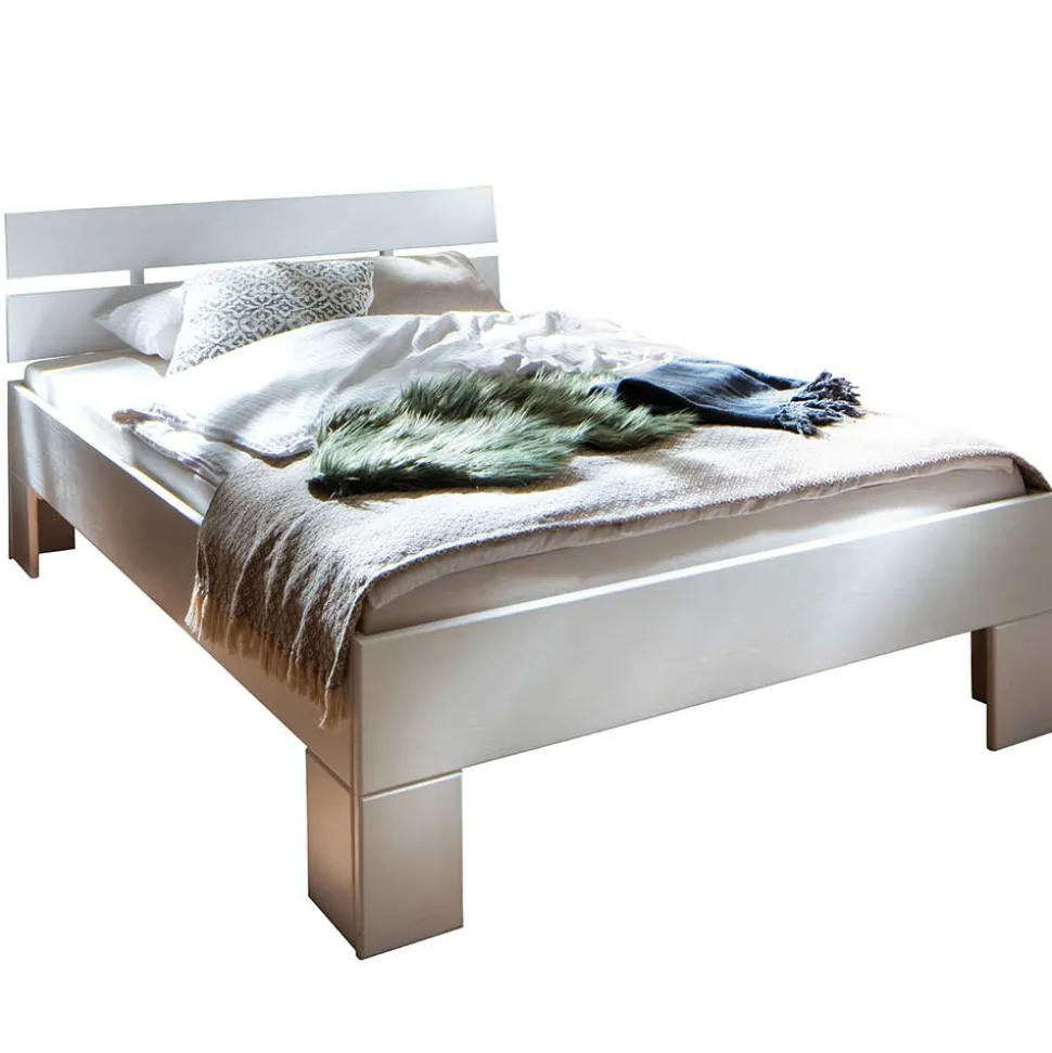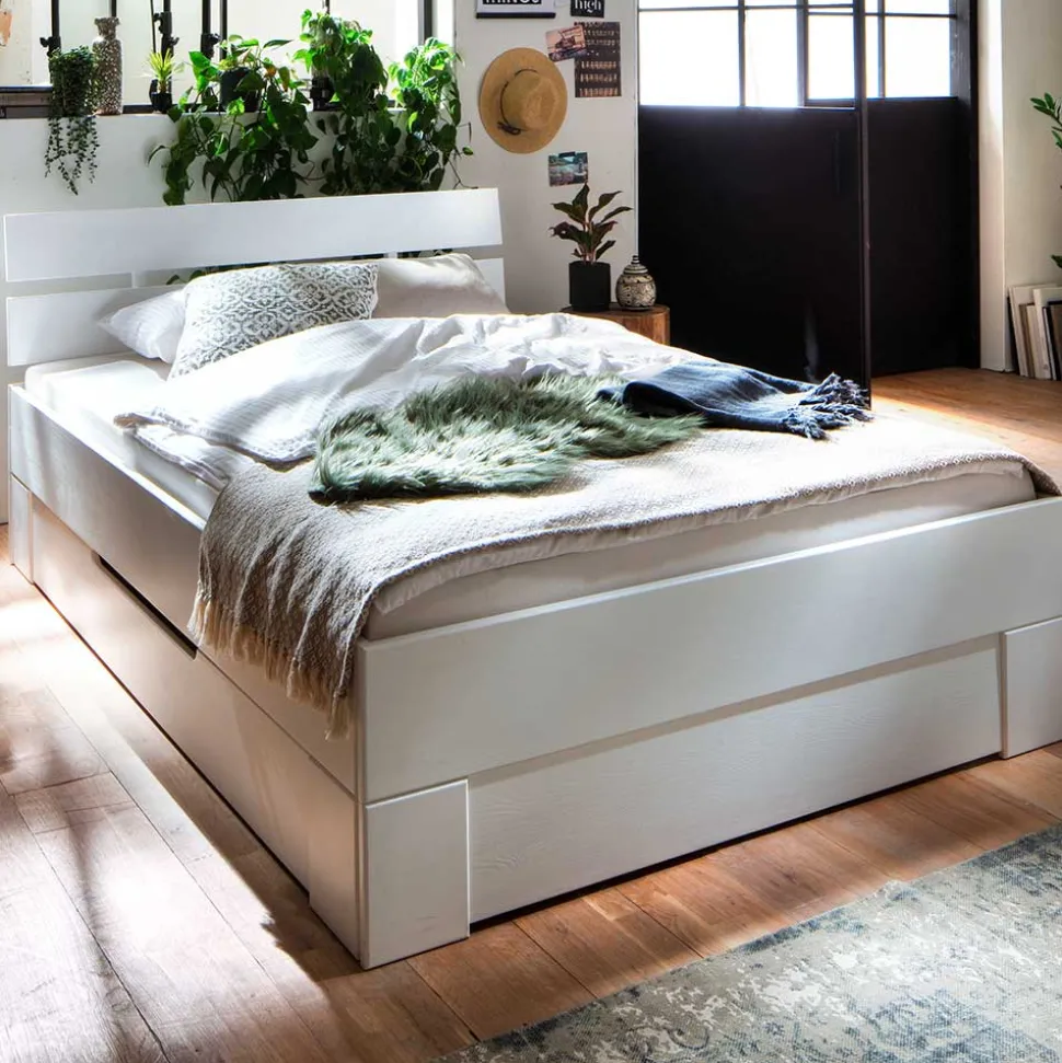 Einrichtungsliebhaber und Designenthusiasten aufgepasst: Das Bett „Snoudy“ fügt sich nahtlos in jedes moderne Schlafzimmer ein. Die klare Linienführung und die sanft weiß lackierten Oberflächen, durch die die natürliche Holzmaserung hindurchscheint, bringen einen Hauch von Natur in Ihr Zuhause. Diese Kombination verleiht dem Raum nicht nur ein ästhetisch ansprechendes Flair, sondern fördert auch ein angenehmes Raumklima.