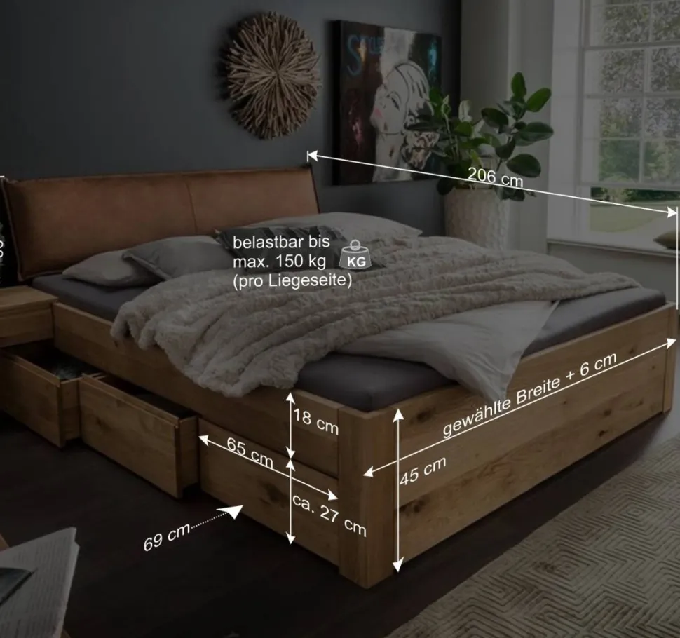 - Tiefe Rahmen ohne Kopfteil: 206 cm, das Kopfteil steht ca. 13 cm über den Rahmen hinaus
