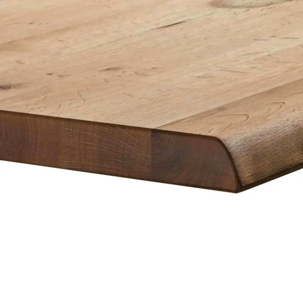 Die solide Tischplatte aus Wildeichenholz, mit einer Stärke von ca. 4 cm, präsentiert sich nicht nur in ihrer robusten Beschaffenheit, sondern auch mit einer natürlichen, geölten Oberfläche, die die lebhafte Maserung des Holzes betont. Risse und Astlöcher sind fachmännisch verspachtelt, was jedem Tisch einen unverwechselbaren Charakter verleiht. Das Highlight bildet die abgerundete, gedrehte Tischkante in angesagter Bootsform, die „Tanina“ zu einem absoluten Blickfang in jedem Raum macht.