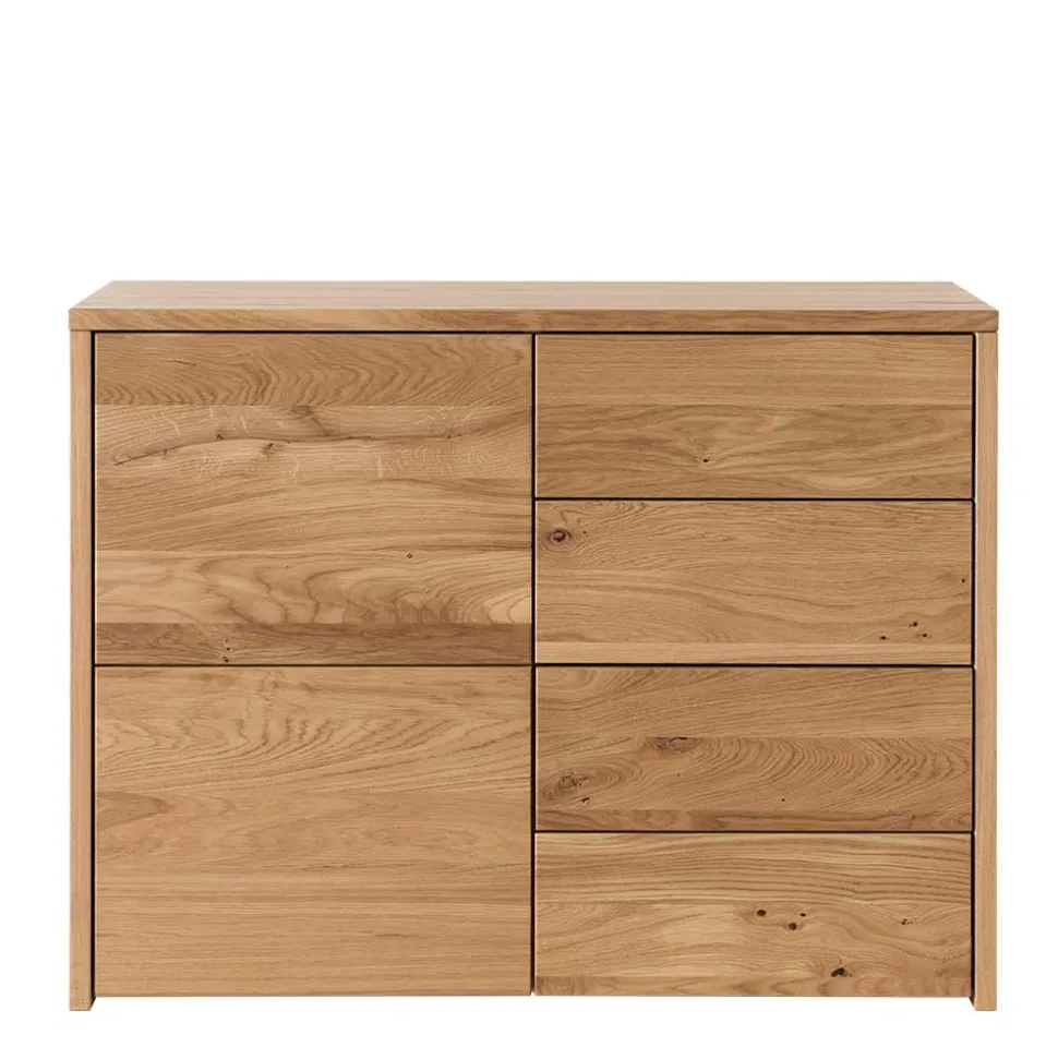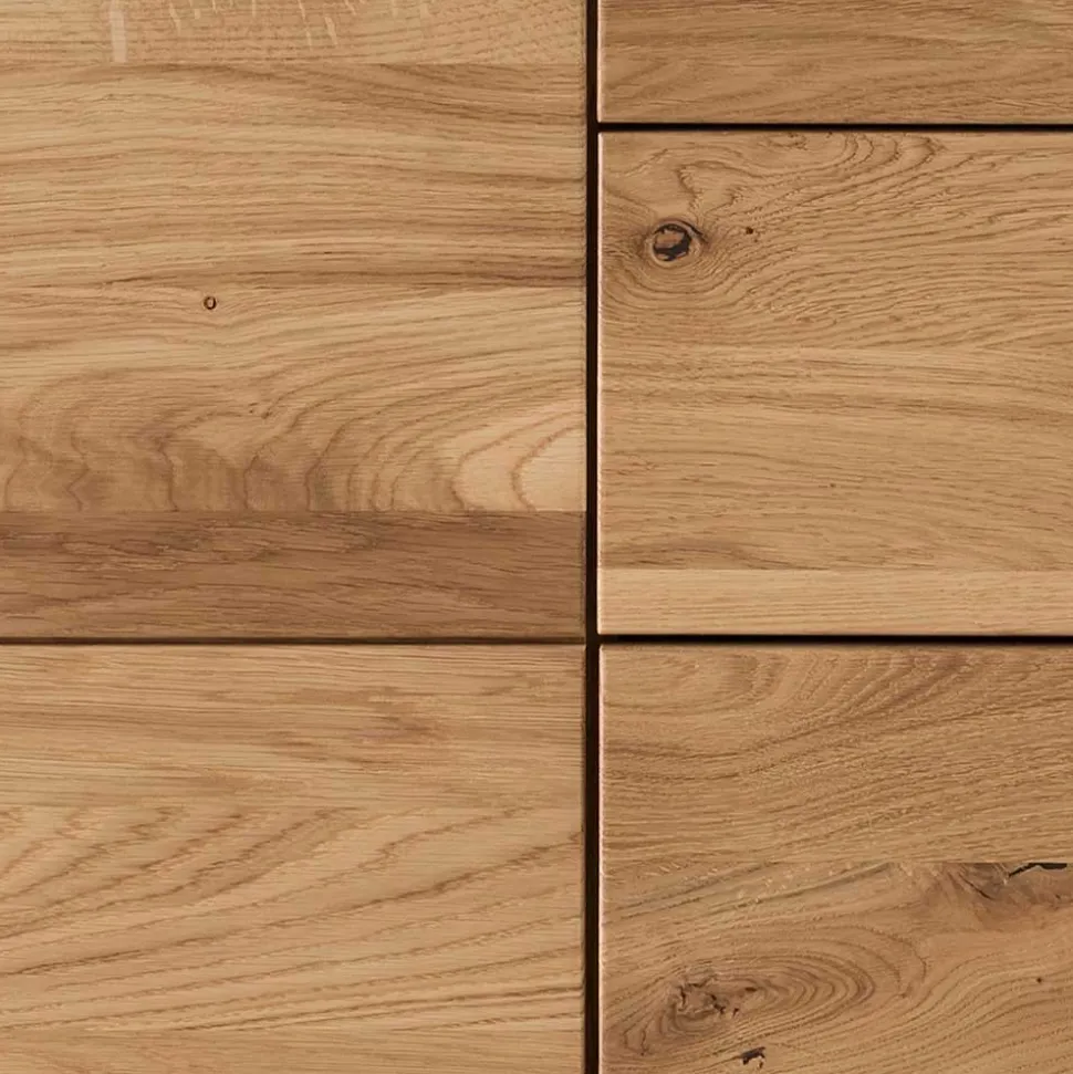 Die Oberfläche der Kommode ist natürlich geölt, was das Wildeichenholz nicht nur schützt, sondern auch die lebendige Maserung betont. Diese Behandlung macht das Holz widerstandsfähiger gegen Schmutz und Flüssigkeiten, während es gleichzeitig atmen kann, was zur Langlebigkeit des Möbelstücks beiträgt.