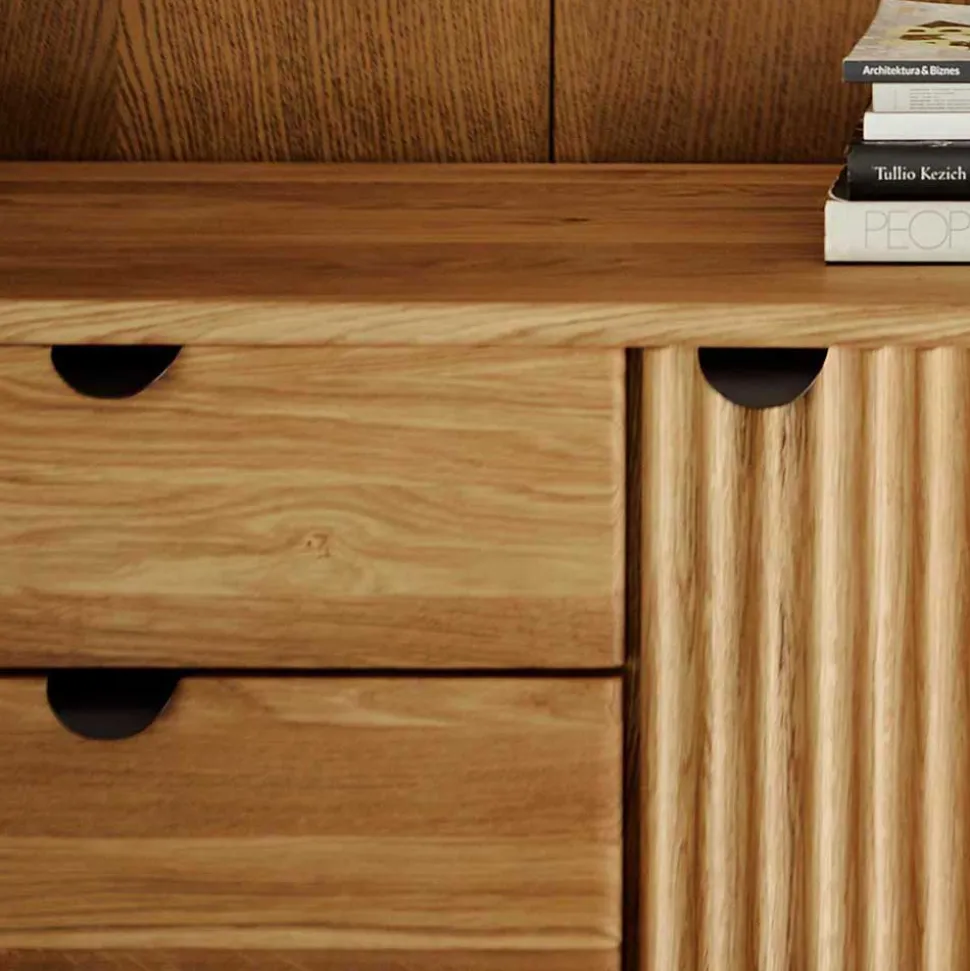 Ausgestattet mit zwei Türen und zwei Schubladen, alle mit Soft Close Funktion und Metallbeschlägen, bietet das Lowboard „Casarius“ ausreichend Platz für Ihre Unterhaltungsgeräte und sonstigen Gegenstände. Die Soft Close Funktion sorgt für ein sanftes und leises Schließen der Türen und Schubladen, während die Türfronten mit aufwändig plastischer Rillenstruktur und dezente Metall-Kantengriffe in Schwarz optische Highlights setzen.