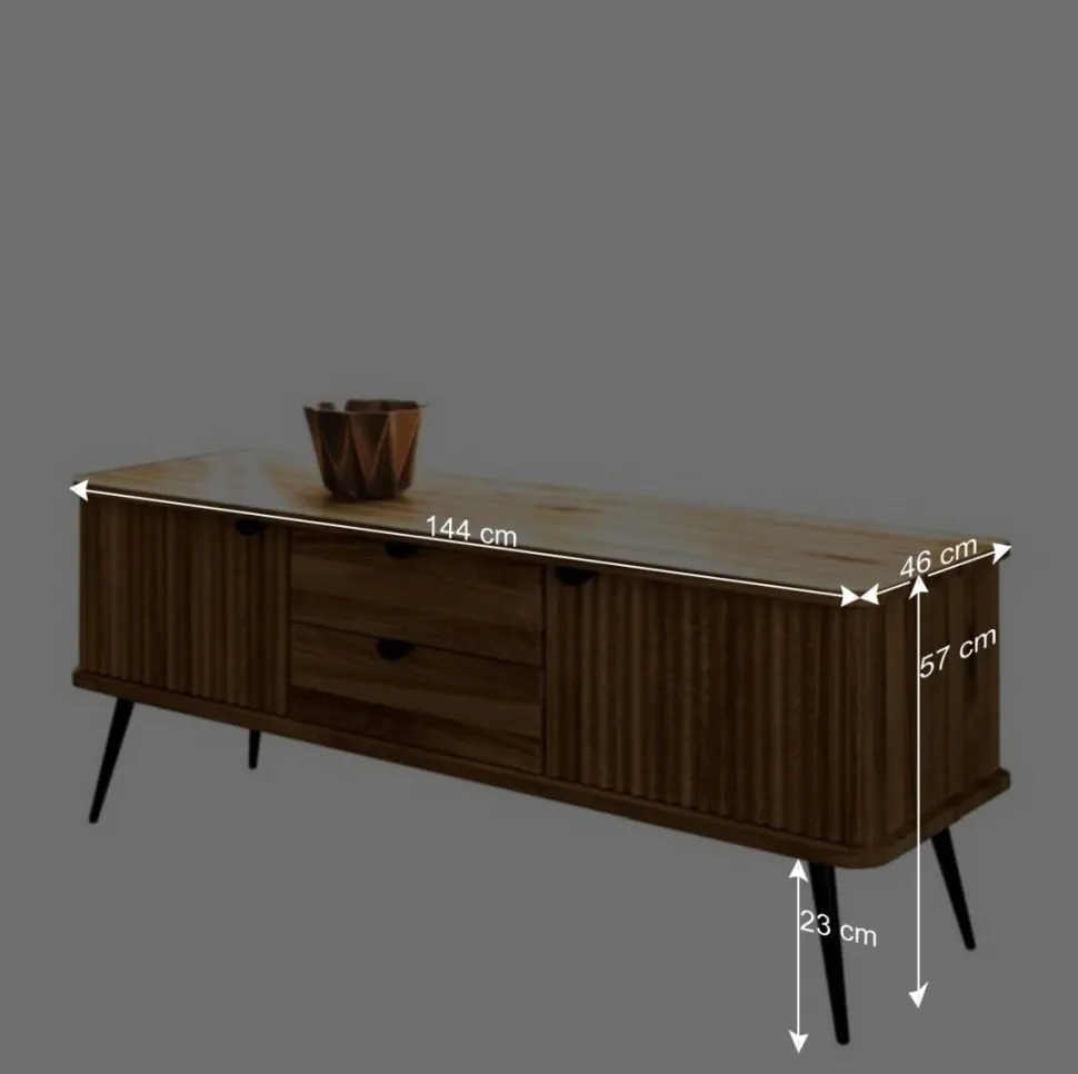 Überstehende Decken- und Bodenplatten mit gerundeten Kanten, eine Materialstärke von ca. 2 cm für Korpus und Fronten sowie durchgehende Lamellen unterstreichen die präzise Verarbeitung und die hohe Materialqualität dieses Lowboards. Mit seinen Maßen von 144 cm Breite, 57 cm Höhe und 46 cm Tiefe bietet das Lowboard „Casarius“ viel Stauraum.