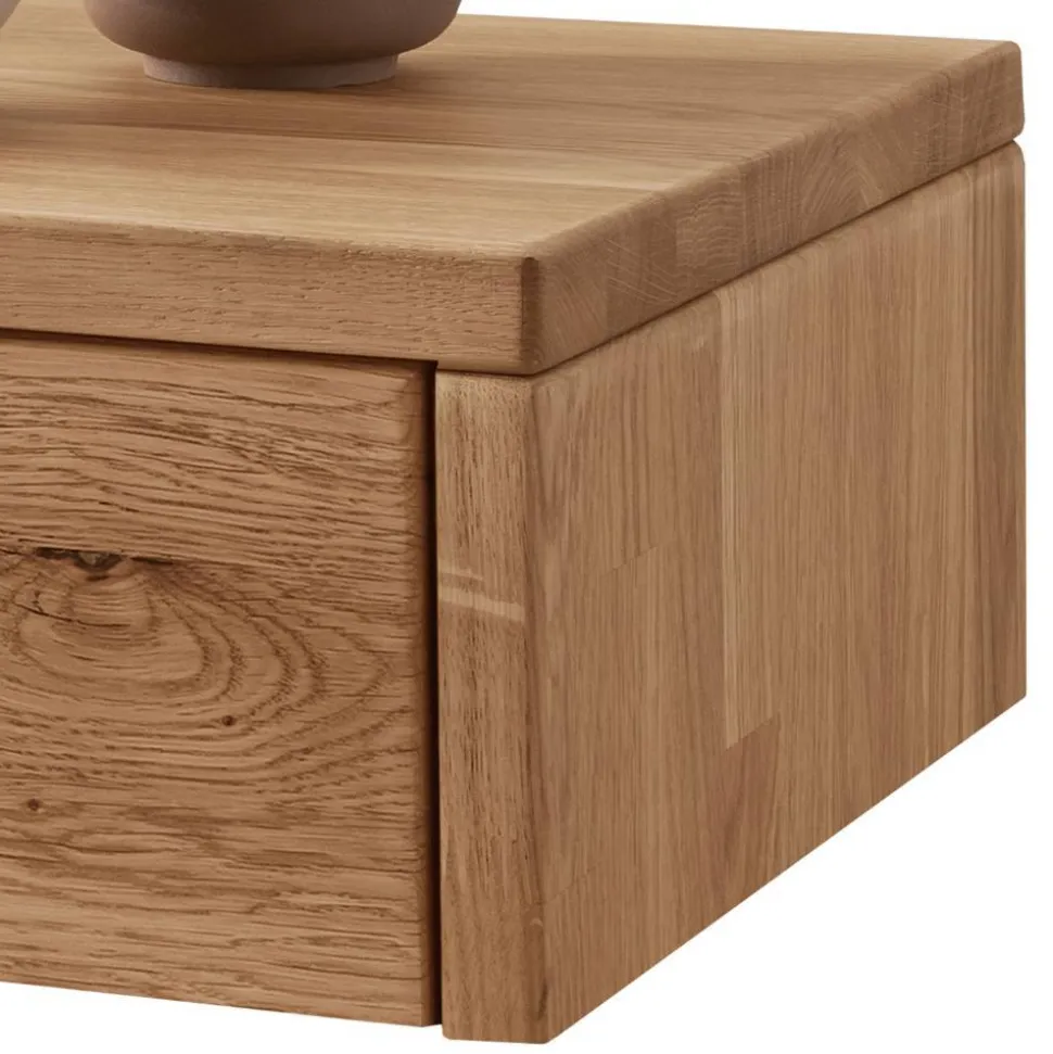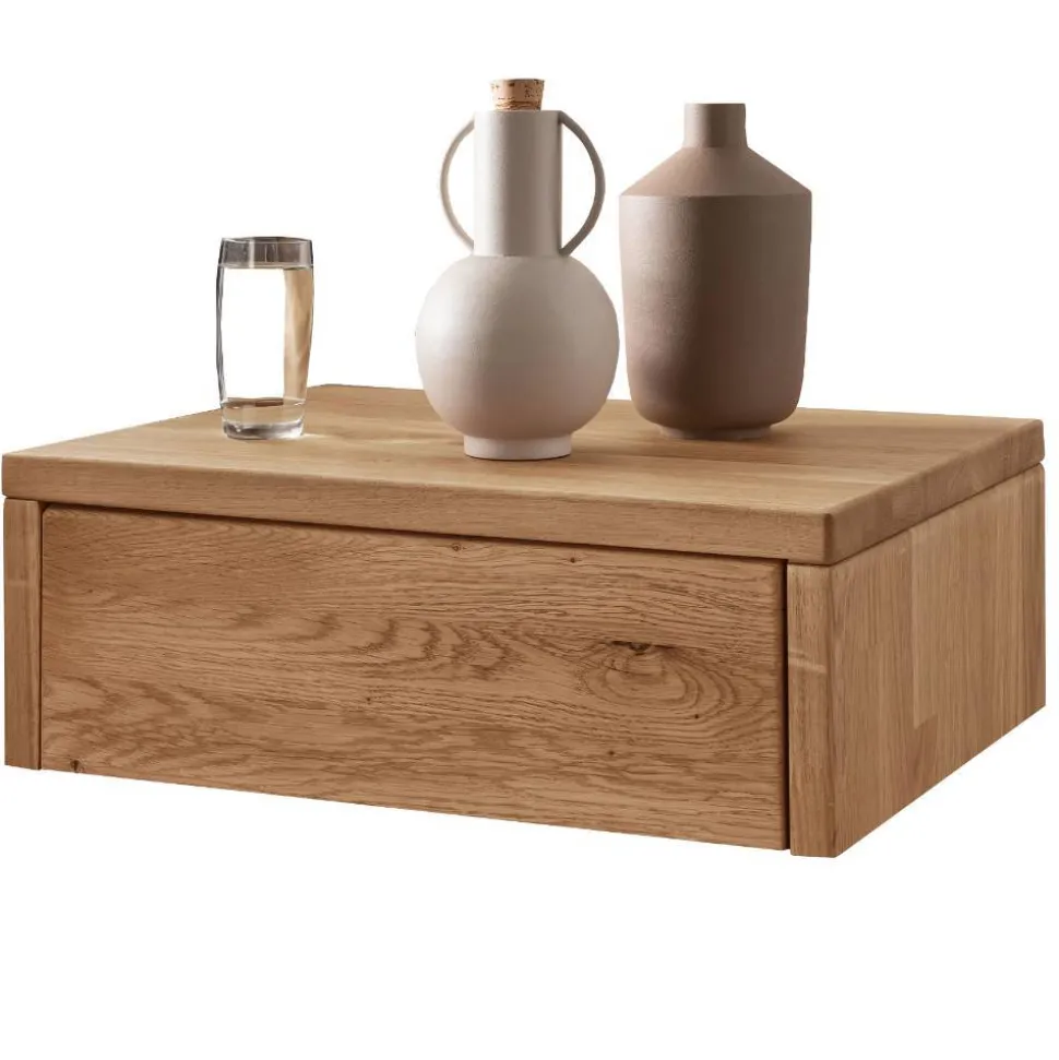 Die Nachtkonsole „Sangre“ begeistert durch ihr puristisches Design und die warme Ausstrahlung massiver Wildeiche. Minimalistisch, modern und funktional fügt sie sich nahtlos in Ihr Schlafzimmer ein. Anstelle von schweren Möbeln wirkt sie leicht und dezent, während sie dennoch praktischen Stauraum direkt am Bett bietet.
