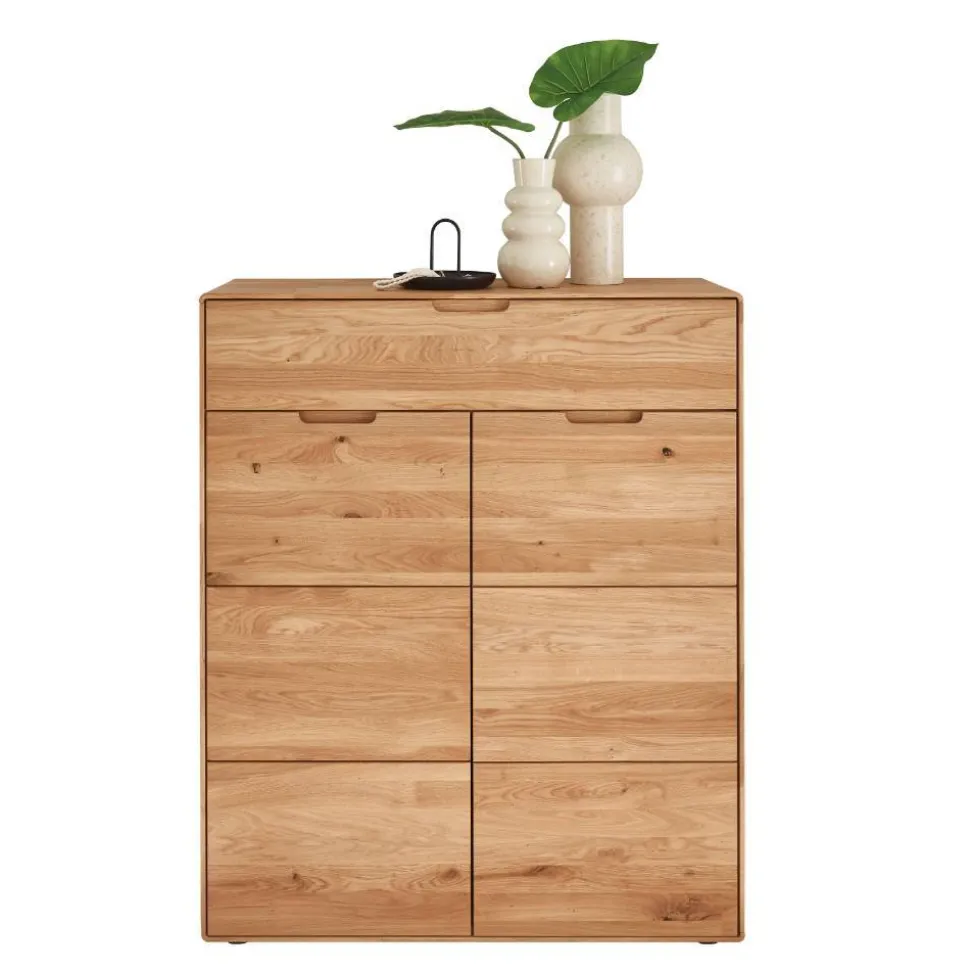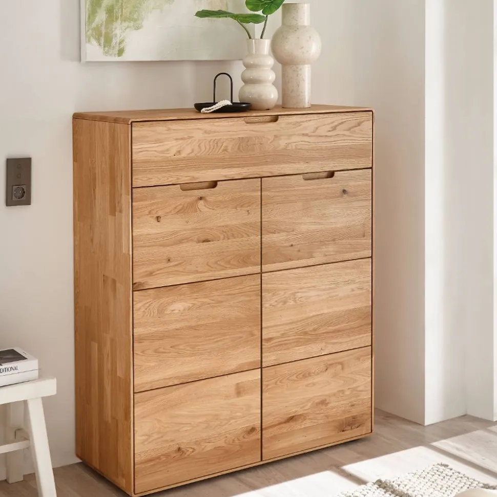 Gefertigt aus hochwertiger Wildeiche Massivholz, besticht der Wildeiche Schuhschrank „Darcona“ durch seine natürliche Haptik und lebendige Maserung. Die geölten Oberflächen bringen die Struktur des Holzes besonders schön zur Geltung. Wölbungen und feine Risse sind Ausdruck des natürlichen Spannungsfeldes – jedes Möbelstück ist ein Unikat. Ein Verzug von bis zu 1,2 % ist bei Massivholz üblich und stellt keinen Reklamationsgrund dar. Die Rückwand besteht aus Holzwerkstoff und bleibt dezent im Hintergrund.