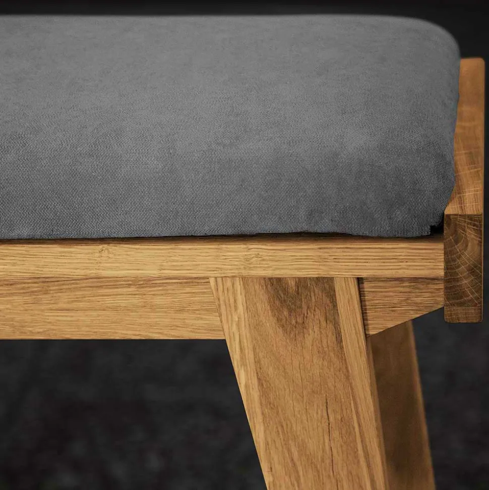Die rechte Seite der Bank bietet eine komfortable Sitzfläche, die mit einem hellgrauen Webstoff (100 % Polyester) bezogen ist. Der Stoff ist nicht nur optisch ansprechend, sondern auch äußerst pflegeleicht und strapazierfähig, ideal für den täglichen Gebrauch. Das lose aufliegende Sitzkissen ist schaumstoffgepolstert und bietet einen hervorragenden Sitzkomfort. Mit einer Sitzbreite von 55 cm, einer Sitztiefe von 35 cm und einer Sitzhöhe von 47 cm lädt die Bank zum Verweilen ein.