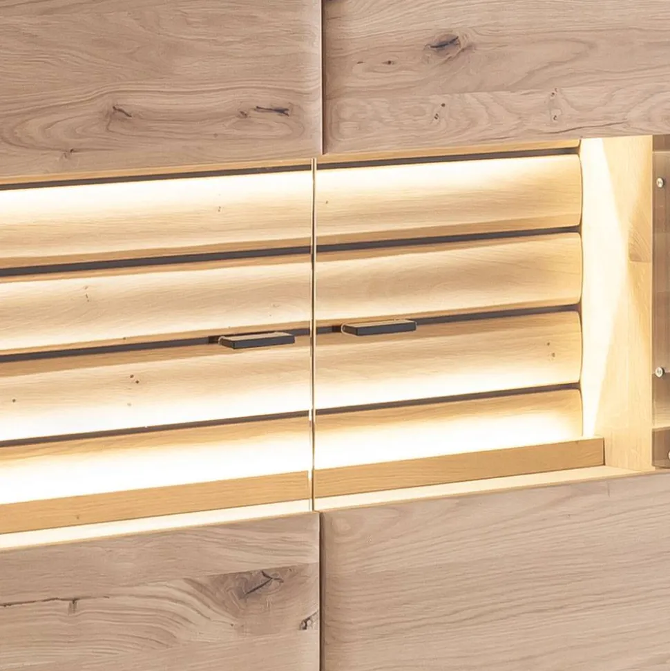 Gefertigt aus massiver Balkeneiche mit hell geölten Oberflächen, beeindruckt „Azzurian“ durch eine hochwertige Verarbeitung: Die Front ist mit durchgehenden Lamellen gestaltet, der Korpus keligezinkt verarbeitet und die Rückwand innen mit Asteiche hell furniert. Sichtbare Rückwände aus massiven Leisten mit stilvoller Schattenfuge unterstreichen den authentischen Charakter. Dezente Metall-Griffleisten in Anthrazit fügen sich harmonisch in das Gesamtbild ein und setzen einen modernen Akzent.