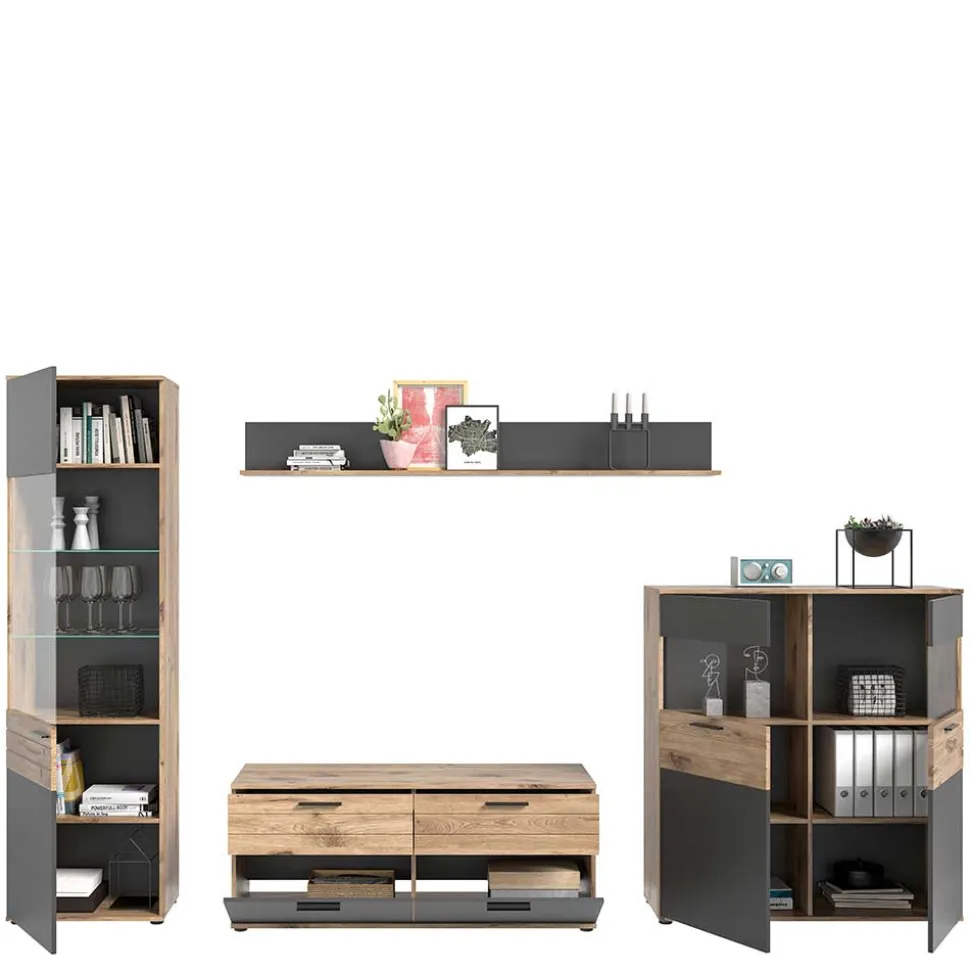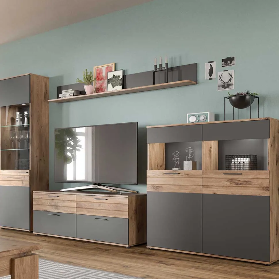 - Trendstarke Wohnwand in Wildeichefarben und Grau