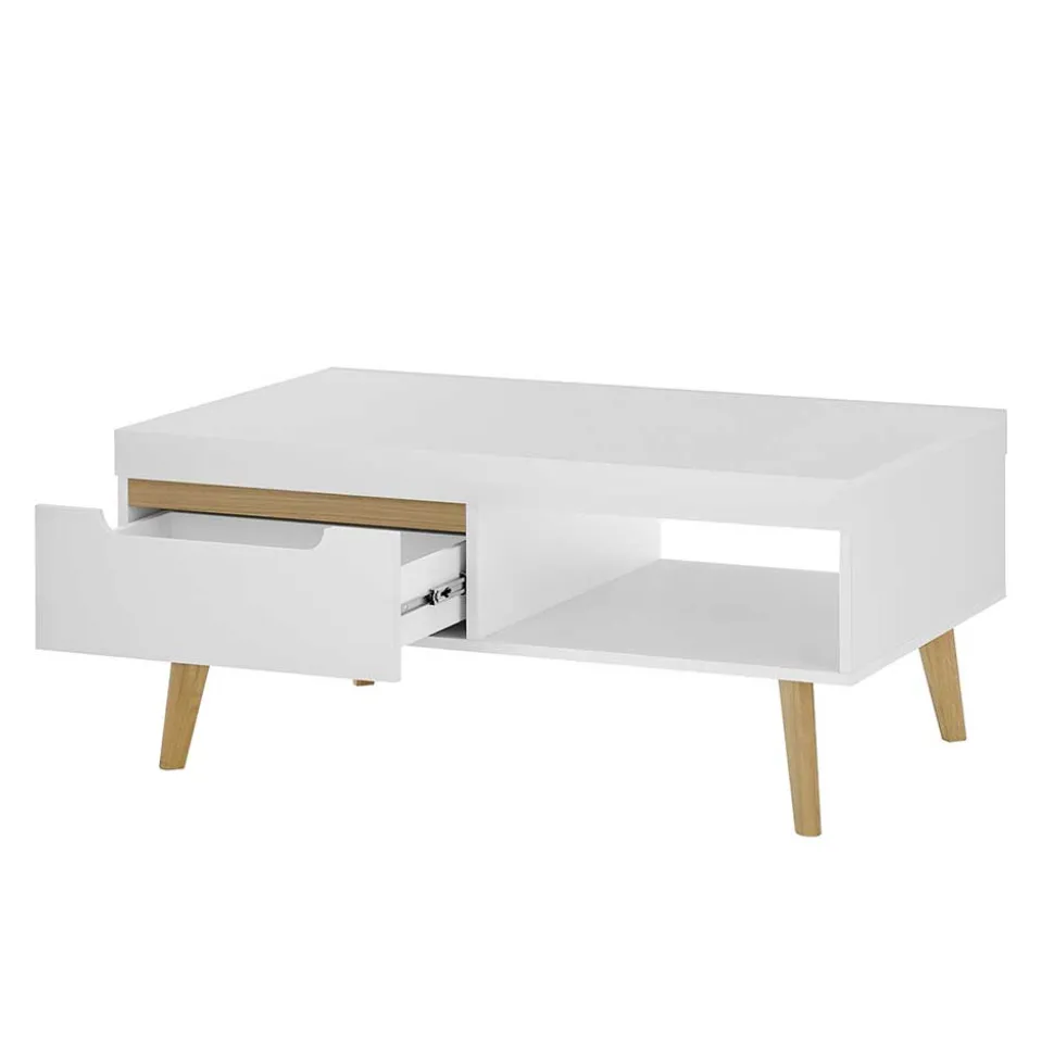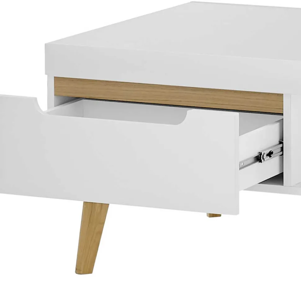 Mit Maßen von 107 cm Breite, 46 cm Höhe und 67 cm Tiefe bietet der Wohnzimmertisch „Ginko“ ausreichend Platz für Ihre Alltagsgegenstände und dekorative Elemente. Die glatte, pflegeleichte Tischplatte lädt nicht nur zum Kaffeetrinken ein, sondern dient auch als robuste Unterlage für Bücher, Tablets oder Spiele. Unterhalb der Tischplatte befinden sich zwei Schubladen mit einem Metallauszug, die einen leichtgängigen und geräuscharmen Betrieb garantieren. Integrierte Griffmulden in attraktiver Eichenfarbe erleichtern die Handhabung und fügen ein stilvolles Detail hinzu. Die offene Ablage bietet zusätzlichen Raum für Zeitschriften, Fernbedienungen oder Ihre Lieblingsbücher.
