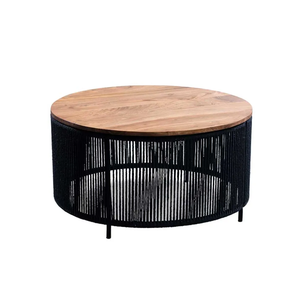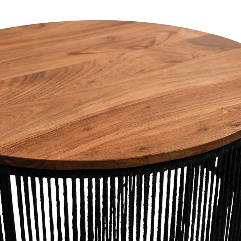 Getragen wird die Massivholzplatte von einem stabilen, schwarzen Metallgestell mit vier Beinen, das dem Tisch eine moderne Leichtigkeit verleiht. Um das Gestell verlaufen zahlreiche senkrechte Elemente aus schwarzer Baumwollkordel, die für eine sockelähnliche Optik sorgen, jedoch weiterhin Licht durchlassen und den Blick auf die Beine freigeben. Diese Gestaltung sorgt für ein Spiel aus Struktur und Transparenz, das den Tisch auch optisch zu einem Highlight im Raum macht.